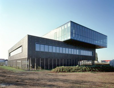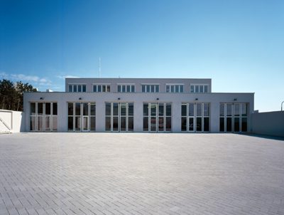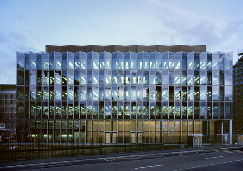 Das Äussere: Die vorhandene Struktur von Mauern und Öffnungen wurde erhalten bzw. wiederhergestellt und das Geschäftsportal als Glashaut davorgesetzt. Die Flächenteilung der Glashaut wiederholt symmetrisch die Gliederung des Mauerwerks. Da dieses aber das gegebene Feld asymmetrisch unterteilt, ergibt sich eine leichte Verschiebung zwischen dem Rhythmus der Wandgliederung und der linienförmigen Teilung der Glashaut, wodurch der Akt des nachträglichen Hinzufügens noch verdeutlicht wird. Auch die Schrift über dem Glasfeld ist etwas Hinzugefügtes, sie kommt von vorne (der vorgestellten Glasschicht) nach hinten zur Wand und lehnt sich dort nur punktweise an. Die Kante des mittleren Mauerpfeilers ist an der Eingangsseite bis in die Höhe des Türsturzes abgerundet. Rundung und Kerbe leiten zur dritten Schicht, dem inneren Glasraster. Die in der vordersten Fläche angestrebte Achsialität wird durch die seitliche Lage des Eingangs wieder stark zurückgenommen. Im Zwischenraum der Fassadenchichtung bildet die horizontale Bewegung des Schliessgitters das physische Äquivalent dieser zweifachen «Verschiebung».