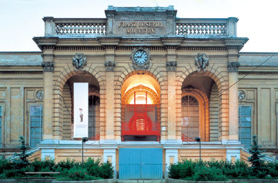 Bildhaftes Pendant zum konkreten Eingang links ist die Auslagenöffnung rechts, das «Tor zur Welt», zur inszenierten Tourismuswirklichkeit. Ein quadratischer Sockel trägt den Globus, beides aus gefärbtem Stuckmarmor. Die Formkonstanz der Kugel bringt im Rahmenwerk der Portalvitrine auch den ruhenden, plastischen Schwerpunkt.