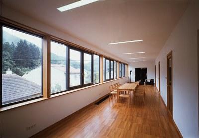 Das Äussere: Die vorhandene Struktur von Mauern und Öffnungen wurde erhalten bzw. wiederhergestellt und das Geschäftsportal als Glashaut davorgesetzt....
