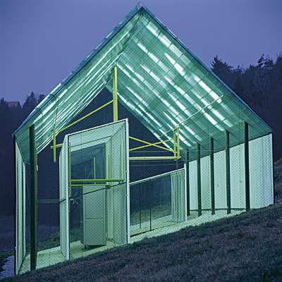 Im Gegensatz zum Wohnbau „schwarzer Laubfrosch“ (ALBUM vom 17. 7. 2004), der die Bewohner mit Farbblasen einschließt, ist sein grüner Verwandter auf maximale Offenheit angelegt. Der Traum der Moderne von der Auflösung der Architektur in der Landschaft wird hier aber nicht naiv weitergedacht. Die Privatsphäre bleibt durch steuerbare Lamellen gewahrt, mit denen der Unterstand verschlossen werden kann. Je nach Laune in Schwarz oder Weiß. Die offenen Giebelseiten sind mit Maschendraht bespannt und werden irgendwann zuwachsen. So sehr das Haus eine Herausforderung für die Bewohner der schrägen Ebene sein mag, so zurückhaltend, ja technisch zeigt es sich nach außen. Landschaftsschutz einmal nicht mit nachgeahmter Tradition, sondern in der Sprache landwirtschaftlicher Nutzbauten.