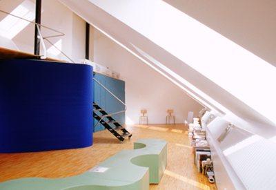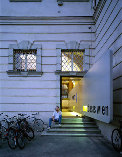 Das Büro der basis wien wurde in einem barocken Saal eingerichtet, der unter Denkmalschutz steht. Die Architekten durften die Wände nicht antasten. Auf die besonderen Nutzungsbeschränkungen reagierten propeller z mit besonderer Fantasie. Die Möblierung und alle Anbauten waren entweder mobile oder freistehende, leicht zerlegbare Einheiten. Man muss sich wundern, dass das Denkmalschutzamt nicht die Gelegenheit ergriffen hat, über diese exemplarisch gelungene Implantation einer radikal zeitgenössischen Architektur in ein eindrucksvolles historisches Ambiente seinen schützenden Amtsarm zu halten. So aber blieb der basis wien nichts anderes übrig, als die mobilen Teile der Einrichtung zu versteigern.