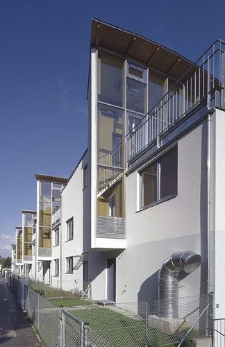 Stadlau, Kamillenweg, Wohnbau, 10 WE, 1 Gemeinschaftshaus, Geladener Wettbewerb (mit Arch. Treberspurg und Raith), 1.Preis, 1987, Realisierung 1989-91