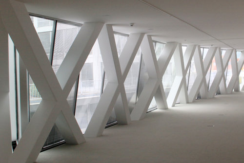 Über Zugstützen gelangen die Kräfte drei Stockwerke darüber zu Schrägstützen, diese wiederum leiten die Lasten auf die zweite Stützenreihe.