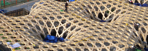 Baustellenbesuch in Metz. Bei strahlendem Herbstwetter zeichnen sich die von Computerbildern her bekannten Hauptelemente des im Entstehen begriffenen Centre Pompidou-Metz klar gegen den blauen Himmel ab. Da ist die «Grande Nef» mit ihrer monumentalen Wand von 21 mal 21 Metern. Da ist das Metallskelett des Turms, den dereinst ein 77 Meter hoher Pfeiler krönen wird. Und da sind die drei 85,5 Meter langen kastenförmigen Galerien, die wie Mikadostäbe übereinanderliegen – die oberste ist noch im Bau. Was dem Rohbau fehlt, ist namentlich das stupende Dach, das der japanische Architekt Shigeru Ban für sein bis anhin grösstes Projekt entworfen hat: eine Struktur aus lamelliertem Holz, die an das Flechtwerk eines chinesischen Huts gemahnt und, mit einer halbdurchsichtigen Membran aus Teflon und Glasfasern bespannt, das gesamte Gebäude überzieht – eine skulpturale Tour de Force des Holzbaus.