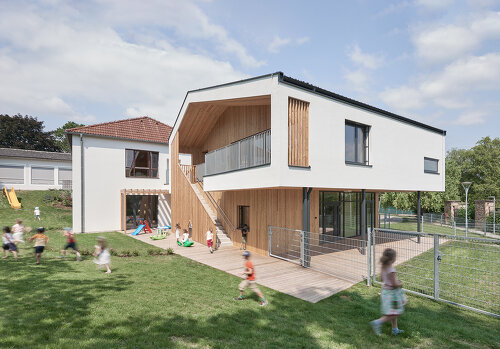Allerdings ist gebauter Raum manchmal langlebiger als eine Lehrmeinung; der pädagogische Raum muss also nicht nur „lehren“, sondern auch selbst „lernen“ können. Kindergartenbauten stehen somit in einem Spannungsfeld zwischen einer Räumlichkeit, die auf eine spezifische gegebene Pädagogik zugeschnitten ist, und den Veränderungen, denen gegenüber er offen sein sollte. Dass der gebaute Kindergarten nicht einfach nur den geforderten gesetzlichen Normen exakt angemessen sein soll, heißt auch, dass ArchitektInnen als AnwältInnen der Kinder auftreten müssen. Sie müssen darauf beharren, dass die Einhaltung von Mindestraummaßen nicht gut genug ist, dass Kindergartenbau keine Frage von quantifizierten Zuteilungen ist, dass es stattdessen um die Qualitäten von Räumen geht, in denen Kinder sich bewegen, essen, lernen, spielen und ruhen können. In den folgenden und davon ausgehenden Beschreibungen steht Holz nicht nur für nachhaltiges Bauen, gutes Raumklima und einen angenehmen Geruch, für ein erlebnisreiches und gleichzeitig robustes Baumaterial, das gerne zur Gestaltung von Maßstäblichkeit und Atmosphäre im Innen- und Außenraum eingesetzt wird, sondern auch für ein Material, das in der Beziehung zwischen pädagogischem Konzept und räumlicher Ausformulierung eine Rolle spielt.