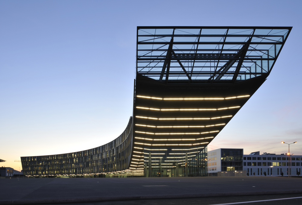 Spektakulär in einem gänzlich anderen Maßstab ist das Verkaufs- und Finanzzentrum der Voestalpine Stahl GmbH in Linz, errichtet nach einem Entwurf von Dietmar Feichtinger, dem hier nach der Donauuniversität in Krems und dem Landeskrankenhaus Klagenfurt sein bisher eindrucksvollster Bau gelungen ist, Signalarchitektur mit Witz und sehr gelungenen Büroräumen im Inneren, diean großzügigen, begrünten Atrien liegen.