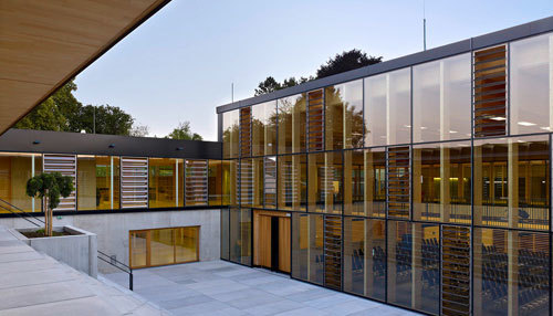 Das Architekturbüro Fink Thurnher sitzt in Bregenz, das Ergebnis ist so etwas wie ein Vorarlberger Wissenstransfer. Das Gebäude wurde bereits mehrmals ausgezeichnet: Für seine Nachhaltigkeit, als „Lernwelt“, für die vorbildhafte Bauherrenschaft und nicht zuletzt als Holzbau. 2007 aus einem Wettbewerb hervorgegangen, errichteten die Architekten ein zukunftsweisendes Bauwerk. Der Passivhausstandard und die hohen Anstrengungen um ökologische Kriterien verstehen sich bei den Vorarlbergern fast schon von selbst. Eine Solaranlage auf dem Dach bereitet Warmwasser auf, eine Hackschnitzelanlage spendet Wärme, es gibt eine Photovoltaikanlage, mechanische Be- und Entlüftung gekoppelt mit Wärmerückgewinnung. Gedämmt wurde mit Schafwolle und Zellulose, und für die WC-Spülungen wird Regenwasser verwendet.