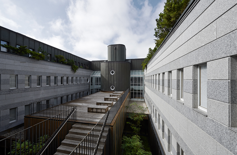 270 junge Menschen lernen und wohnen nun hier. Sie werden praktisch und theoretisch für das Leben als (Nebenerwerbs-)Bauer ausgebildet. Wie bei einem „Vierkanter“ bildet der zentrale Innenhof das Zentrum der Schule. Der Bau ist von Holz dominiert. Das kann bald einmal zu viel werden, hier aber nicht, weil die eingesetzte heimische Weißtanne in unterschiedlichsten Formen, hochwertig und meist unbehandelt, verarbeitet wurde.