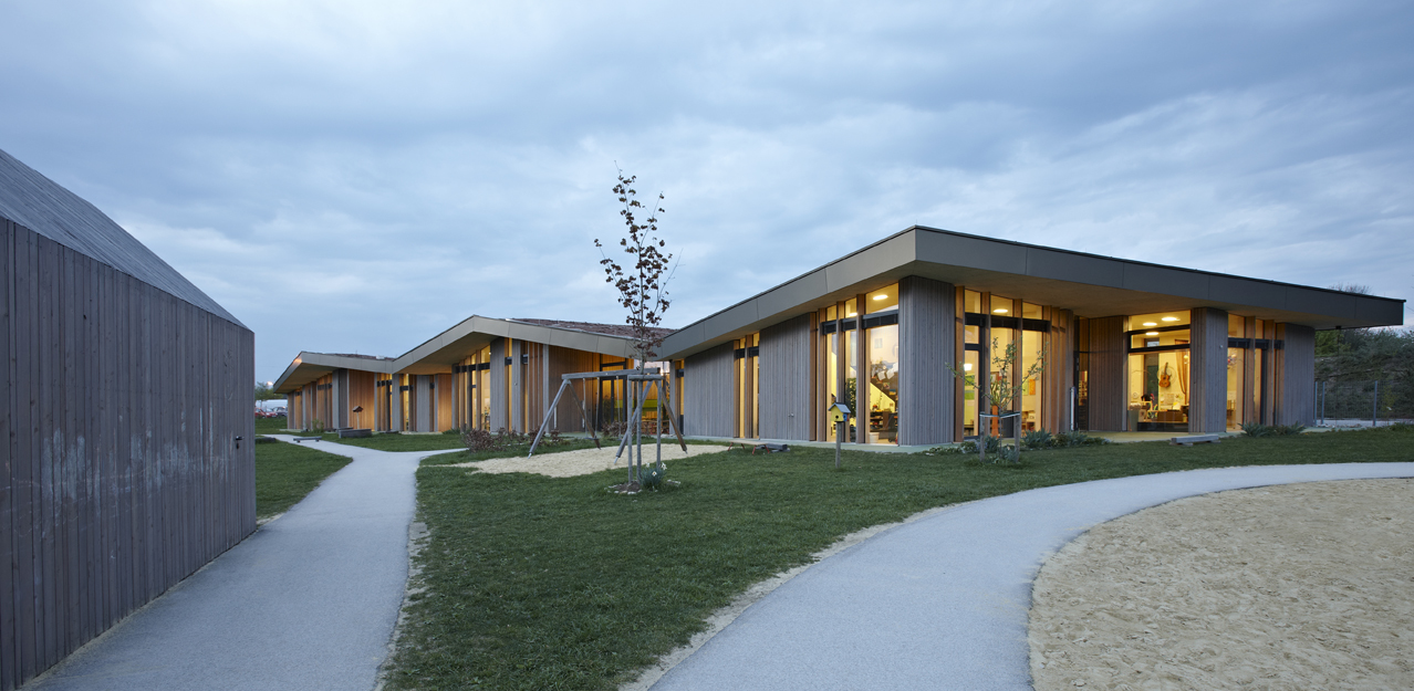 Der Kindergarten in der Solar City von X-Architekten (Linz/ Wien) ist ein vorbildhafter Erlebnisraum für Kinder und Betreuer. Es handelt sich um einen reinen Holzbau in Niedrigstenergiebauweise. Das Grundstück liegt am Übergang der Wohnbebauungen zu der künstlich angelegten Landschaft rund um den Weikerlsee. Alle Gruppenräume orientieren sich ins Grüne und nach Süden. Beste natürliche Belichtung versteht sich damit von selbst. Im Inneren gibt es keine Gänge im herkömmlichen Sinn. Stattdessen sind die Erschließungsflächen so angelegt, dass sie in den Pausen und bei Schlechtwetter voll genutzt werden können. Mittendrin ist der multifunktionale „Marktplatz“, der als Zentrum dient. Hier wird gegessen, hier kann aber auch die Krabbelstube erweitert werden und hier finden auch die größeren Treffen statt.