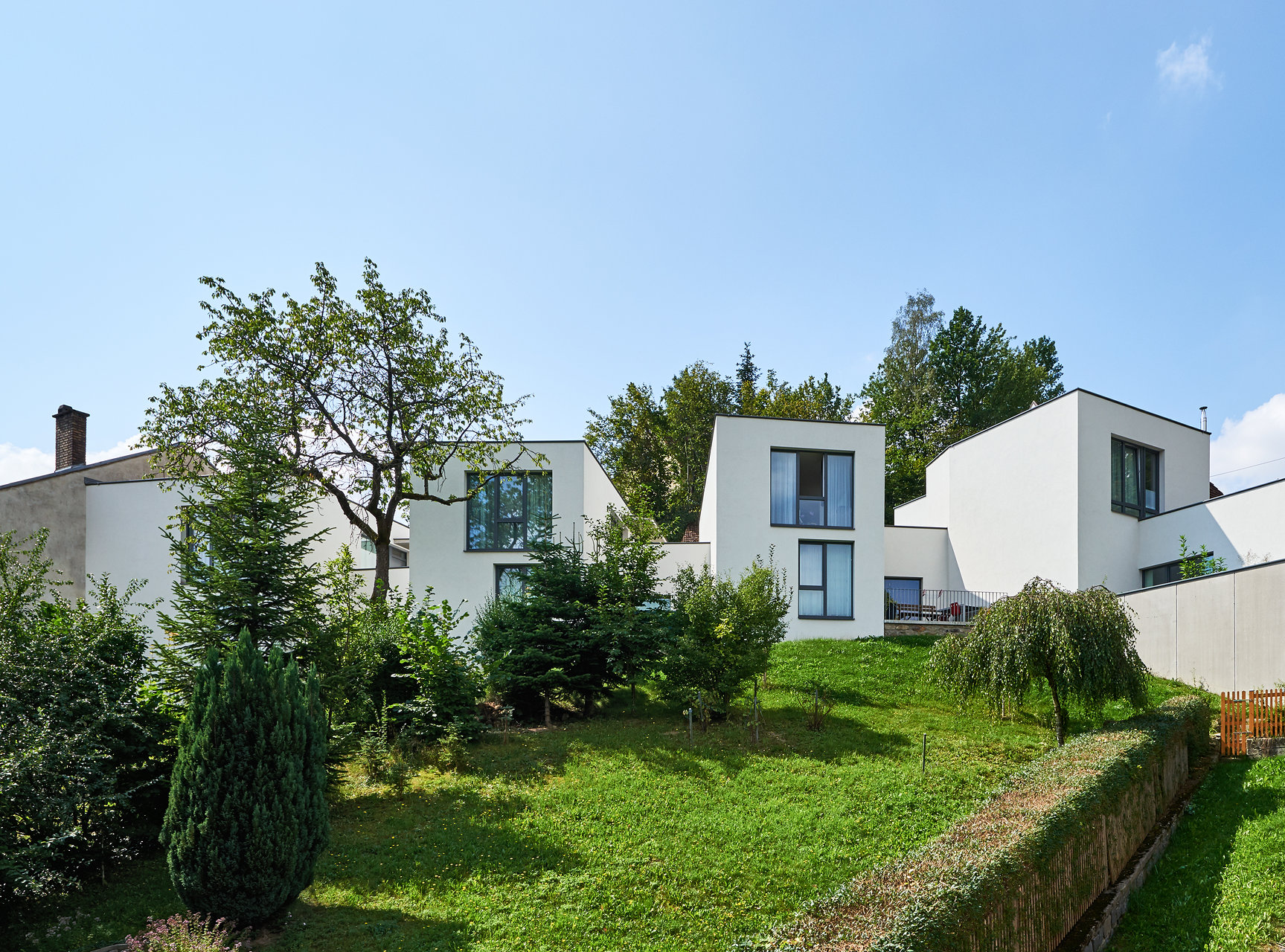 Lokale Denk- und Bauweisen übernehmen und etwas Neues schaffen, das mit unserer modernen globalisierten Welt im Einklang steht, das gelang auch bei den zwei weiteren Preisträgern in ländlicher Umgebung. Im burgenländischen Weingraben war auf dem Hof der Großmutter vom Ehemann der Enkelin schon länger Schnaps gebrannt worden, und so reifte bei Elisabeth und Claus Schneider der Wunsch, auf dem Grundstück ein Domizil für die eigene Familie zu errichten. Mit Architekt Jury Troy, Vorarlberger wie der Bauherr, aber schon lange in Wien ansässig und mit den Bautraditionen Ostösterreichs vertraut, wurde der Streckhof weitergebaut. Hinter der Scheune, die zur Schnapsbrennerei umfunktioniert wurde, entstand das neue Haus neben dem Nachbarstadel. Zwischen halbmeterdicken seitlichen Ziegelwänden ein Holzbau, verputzt mit ungefärbtem Kalkzementputz, schlicht und unprätentiös in der Sprache der Region. Raumhohe breite Fenster mit vorgelagerten Loggien sorgen für viel Bezug zum Freien, im ungenutzten Zustand machen Faltschiebeläden aus Holz das Haus blickdicht. Mit naturbelassenen Materialien aus nachwachsenden Rohstoffen hinterlässt der Neubau einen mindestens so geringen ökologischen Fußabdruck wie jene Bauten, die das Bild der Gegend über Jahrhunderte prägten und heute – sofern noch vorhanden – vom Verschwinden bedroht sind.