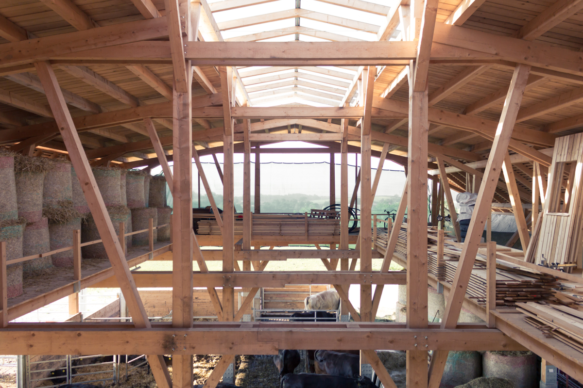2010 kam mit Josephine, heute zehn Jahre alt, die erste Wagyu-Kuh auf den Hof. In der Zwischenzeit ist die japanische Rindertruppe auf gut 40 Stück angewachsen. Für genau diese Anzahl entwarf der Wiener Architekt Herbert Schrattenecker, eine Empfehlung von Freunden aus dem Hausruck-Kreis, letztes Jahr einen Stall, der dem noblen Vieh alle Ehre erweisen sollte. Schratteneckers Antwort auf die Bauaufgabe ist ein rund 25 mal 15 Meter großes und acht Meter hohes Stabwerk aus massiver Fichte, das in seiner außergewöhnlichen Konstruktionsweise die Charakteristika von japanischem Holzbau und historischen Dachstühlen aus dem Sakralbau, wie sie in Oberösterreich immer wieder zu finden sind, in sich vereint.