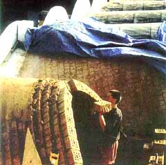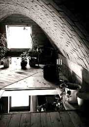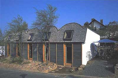 Je vier Studenten teilen sich Küche, Dusche und Toiletten. Über dem Flur liegt eine Schlafgalerie unter dem nach Süden ansteigenden Gewölbe. Diese zweite Ebene kann auf vorhandenen Balken bis zur ganzen Haustiefe individuell erweitert werden. Jeder Raum besitzt eine Terrassentür und ein Dachfenster nach Süden und zur Querlüftung ein kleines Nordfenster auf der Schlafgalerie. Die Lehmmauer im Süden ist transluzent gedämmt, die auftreffende Sonnenstrahlung wird zeitversetzt als Strahlungswärme an den Raum abgegeben und ergänzt die Innenwandheizung. Die Baustoffwahl erfolgt nach ökologischen Gesichtspunkten: Lehm, Gasbeton, Holz, Papier, Wolle, ...
