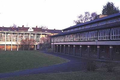Über einen verglasten, im Geländeverlauf abgetreppten Gang werden die drei eingeschossigen Pavillons erschlossen. Den jeweils vier Klassenräumen sind ein Lehrerzimmer und ein kleiner Pausenhof zugeordnet. An den leicht terrassierten Schulhof grenzt die große Spielwiese, an deren Ende 1961 eine Turnhalle mit darunterliegendem Lehrschwimmbecken gebaut wird. Ein Wandmosaik, eine Milchbar, eine Bronzeplastik und ein Brunnen gilt es als Kunst am Bau zu entdecken. Wie der Gesamteindruck der wohlproportionierten Fassade durch neue Fenster zerstört werden kann, ist leider bereits an einigen Stellen zu besichtigen.