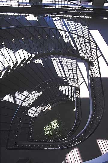 Im Eingangsbau befindet sich das Treppenhaus, das filigran verglast und sehr großzügig angelegt ist. Die freitragende geschwungene Treppe ist zur optimalen Erschließung im Schnittpunkt der beiden Büroflügel untergebracht. Die Kundenhalle im Erdgeschoß ist durch den 1984 vorgenommenen Einbau eines abgehängten Beleuchtungssystems leider verunstaltet.