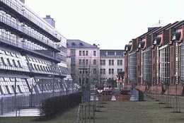Bis auf den Schornstein wird alles abgerissen und durch eine Architektur ersetzt, die das verlorene Erscheinungsbild zitiert. So wird das im Prinzip intakte Blockheizkraftwerk durch ein ebensolches ersetzt. Erst mit dem Institutsneubau Technik III/1 (Bild) von 1995 findet man einen angemessenen Umgang mit der Altbausubstanz.