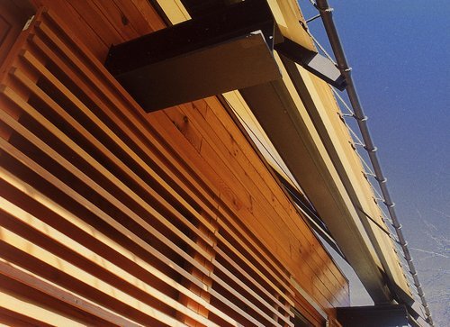 Die Trakte erinnern an die alten Strohgedeckten Häuser, sind aber in jedem Detail kultiviert. Ein Stahlgerüst trägt, beiderseits beplankt, das Dach, geformt aus Stahlgerippe, ist außen mit Segeltuch überspannt, gedämmt, innen mit Sperrholz ausgekleidet. (Text: Architekt)