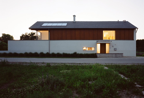 In einer Siedlung am Rande des Stadtgebiets schafft es mit seinem L-förmigen Grundriss eine gartenseitige Hofsituation.
