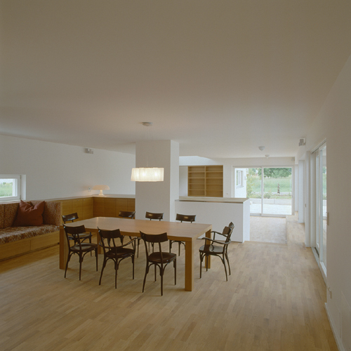Der Ess- und Wohnbereich, welche durch einen Kamin und einen Niveausprung im Fußboden voneinander getrennt sind, orientieren sich mit großflächigen Verglasungen zu diesem sichtgeschützten