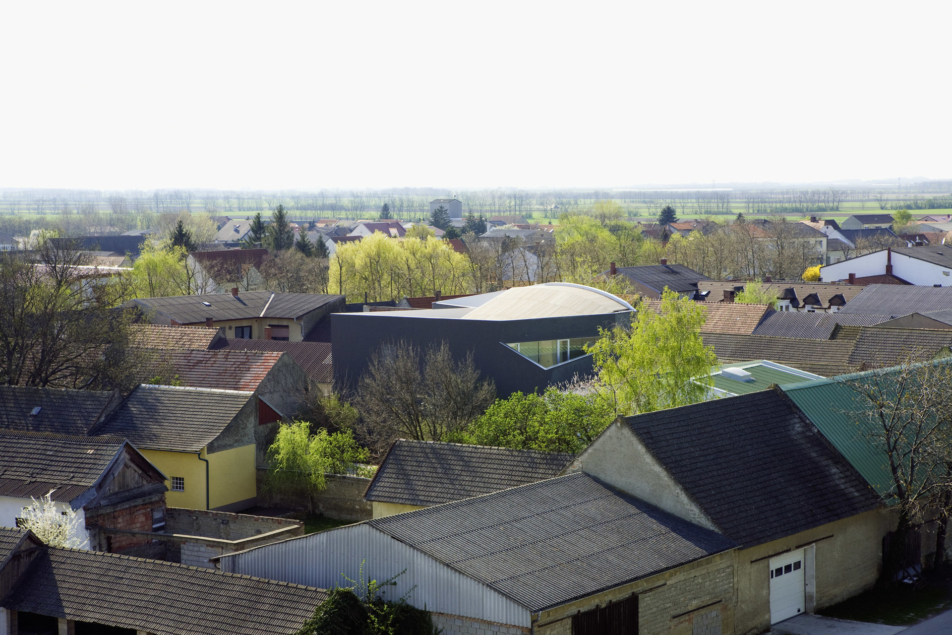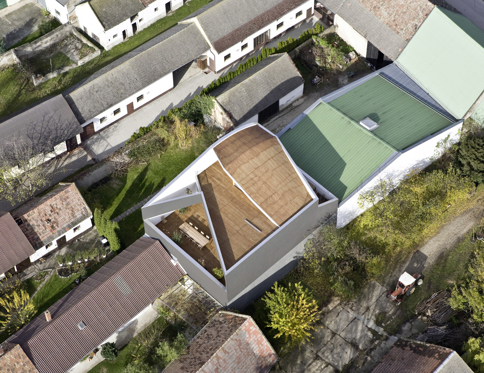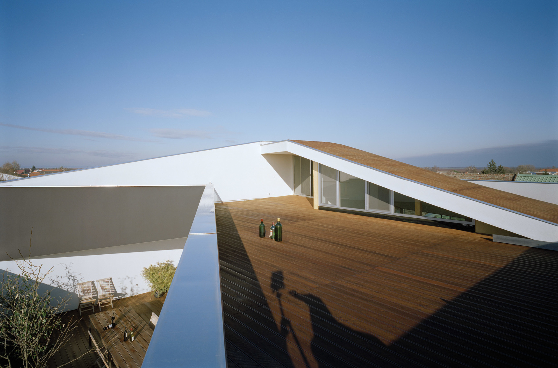 Der Erdgeschoss Grundriss des Neubaus besteht aus einem Rechteck und das Obergeschosses aus einem Parallelogramm das zu den Himmelsrichtungen orientiert ist. Diese beiden Grundformen werden durch eine Reihe von Raumdiagonalen verbunden und in eine fliesende Gesamtform überführt. So entsteht eine Reihe von vielfältigen Räumen, Ausblicken und Topographien die sich auf den Sonnenstand, Innenhof und das weiter Umfeld beziehen. Die Restmengen des Parallelogramms ergeben eine Ost- und Westterrasse die für Veranstaltungen und Weinpräsentationen genutzt werden. Der Innenraum kann durch eine großflächige Schiebwand und vier große Türen als Großraum oder als einzelne Räume genutzt werden. In der Mitte des Weinlofts liegt ein holzverkleidetes Pentagon das Nassräume und Küche zusammenfasst. Die Gebäudekonstruktion besteht aus Beton- und Mauerwerk und dazwischen liegenden Holzdecken und Wänden. Alle Terrassen sind mit Holzdielen verlegt und das Gebäude ist außen in dunklem steingrau und innen weiß verputzt. Die Orientierung der Glasfassaden, die integrierten ausladenden Vordächer und die sehr gute Isolierung ermöglichen ein ganzjährlich angenehmes Raumklima durch den winterlicher Energieeintrag, guten Sonnenschutz und Querlüftung. Text: Architekt