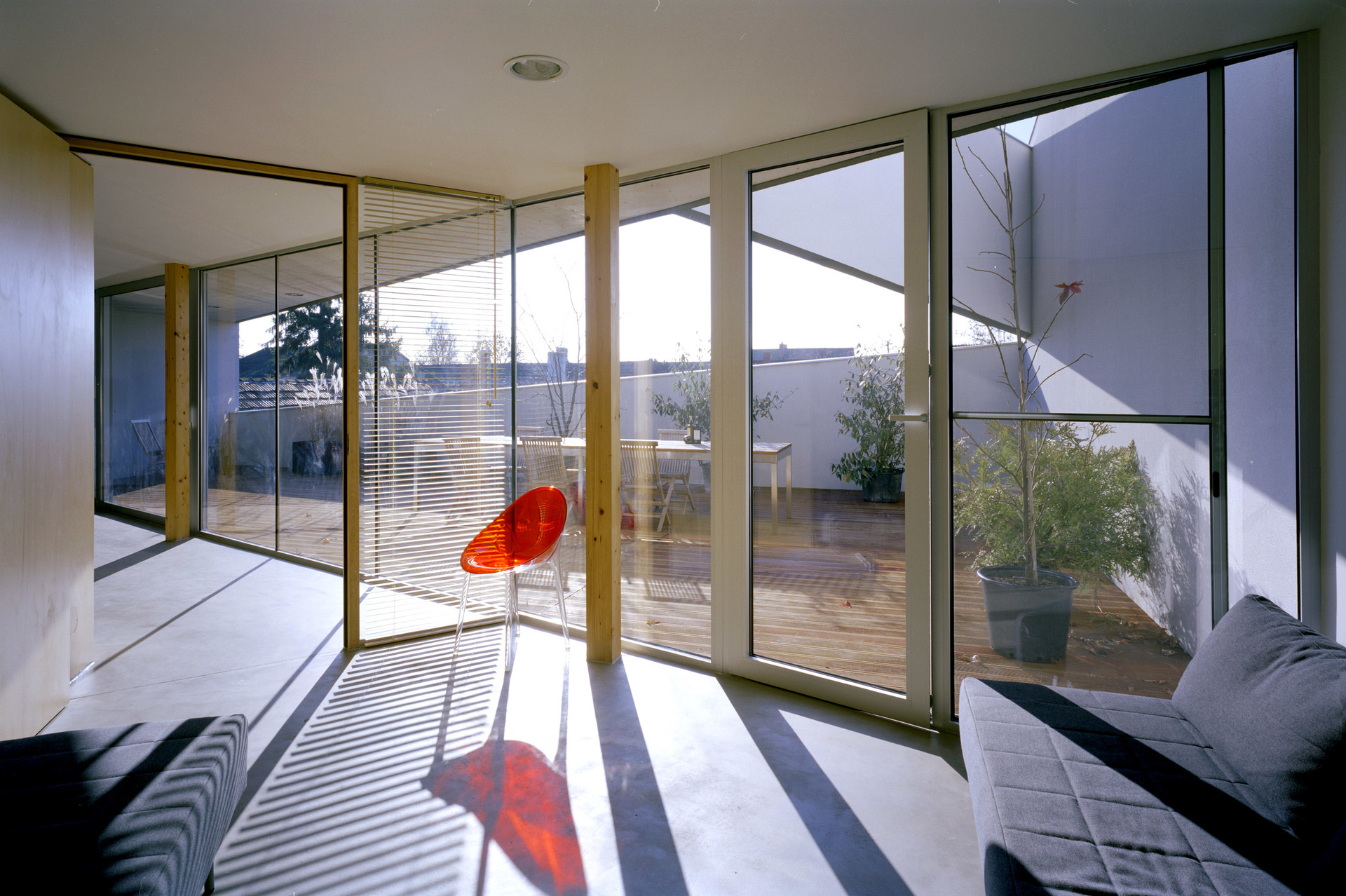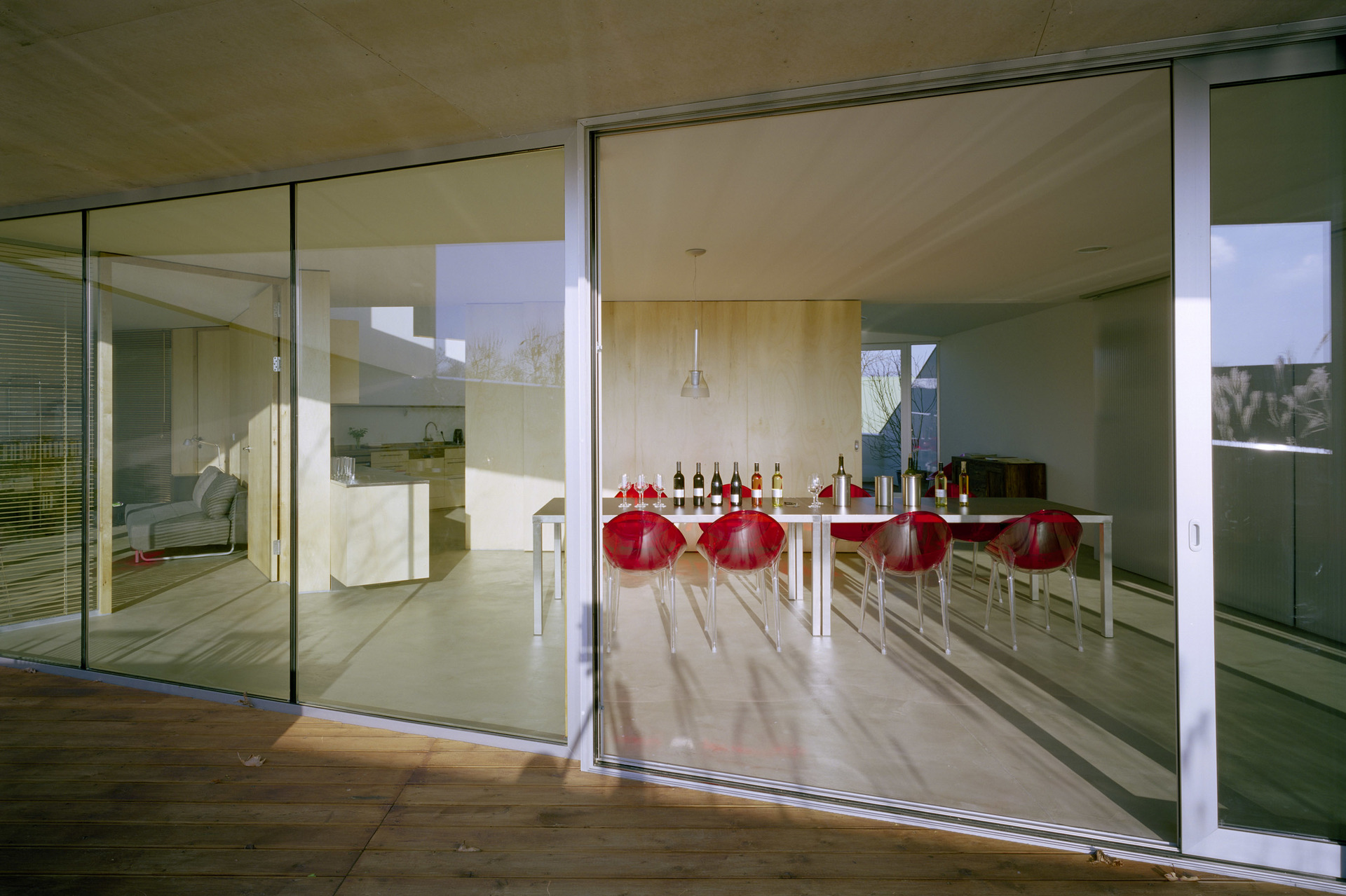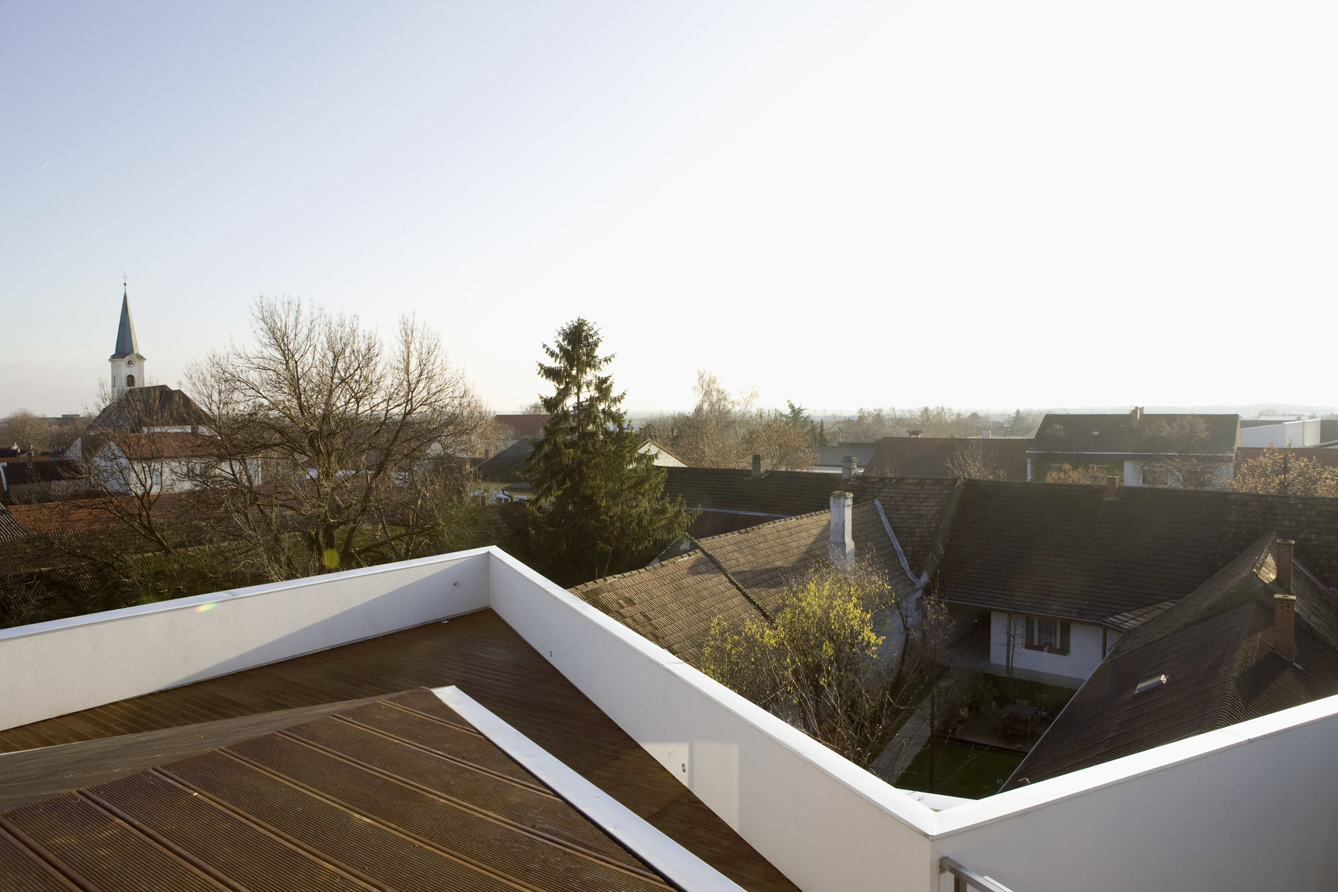 Der Erdgeschoss Grundriss des Neubaus besteht aus einem Rechteck und das Obergeschosses aus einem Parallelogramm das zu den Himmelsrichtungen orientiert ist. Diese beiden Grundformen werden durch eine Reihe von Raumdiagonalen verbunden und in eine fliesende Gesamtform überführt. So entsteht eine Reihe von vielfältigen Räumen, Ausblicken und Topographien die sich auf den Sonnenstand, Innenhof und das weiter Umfeld beziehen. Die Restmengen des Parallelogramms ergeben eine Ost- und Westterrasse die für Veranstaltungen und Weinpräsentationen genutzt werden. Der Innenraum kann durch eine großflächige Schiebwand und vier große Türen als Großraum oder als einzelne Räume genutzt werden. In der Mitte des Weinlofts liegt ein holzverkleidetes Pentagon das Nassräume und Küche zusammenfasst. Die Gebäudekonstruktion besteht aus Beton- und Mauerwerk und dazwischen liegenden Holzdecken und Wänden. Alle Terrassen sind mit Holzdielen verlegt und das Gebäude ist außen in dunklem steingrau und innen weiß verputzt. Die Orientierung der Glasfassaden, die integrierten ausladenden Vordächer und die sehr gute Isolierung ermöglichen ein ganzjährlich angenehmes Raumklima durch den winterlicher Energieeintrag, guten Sonnenschutz und Querlüftung. Text: Architekt