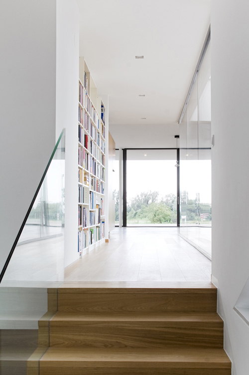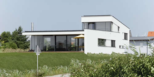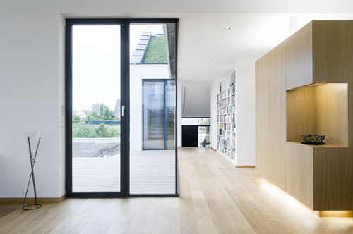 Eine Wandscheibe mit horizontalen Fensterbändern schirmt den privaten Außenbereich gegenüber dem Radweg ab, während sonst Sichtbeziehungen und Durchblicke das Haus prägen.