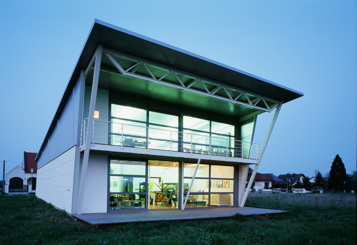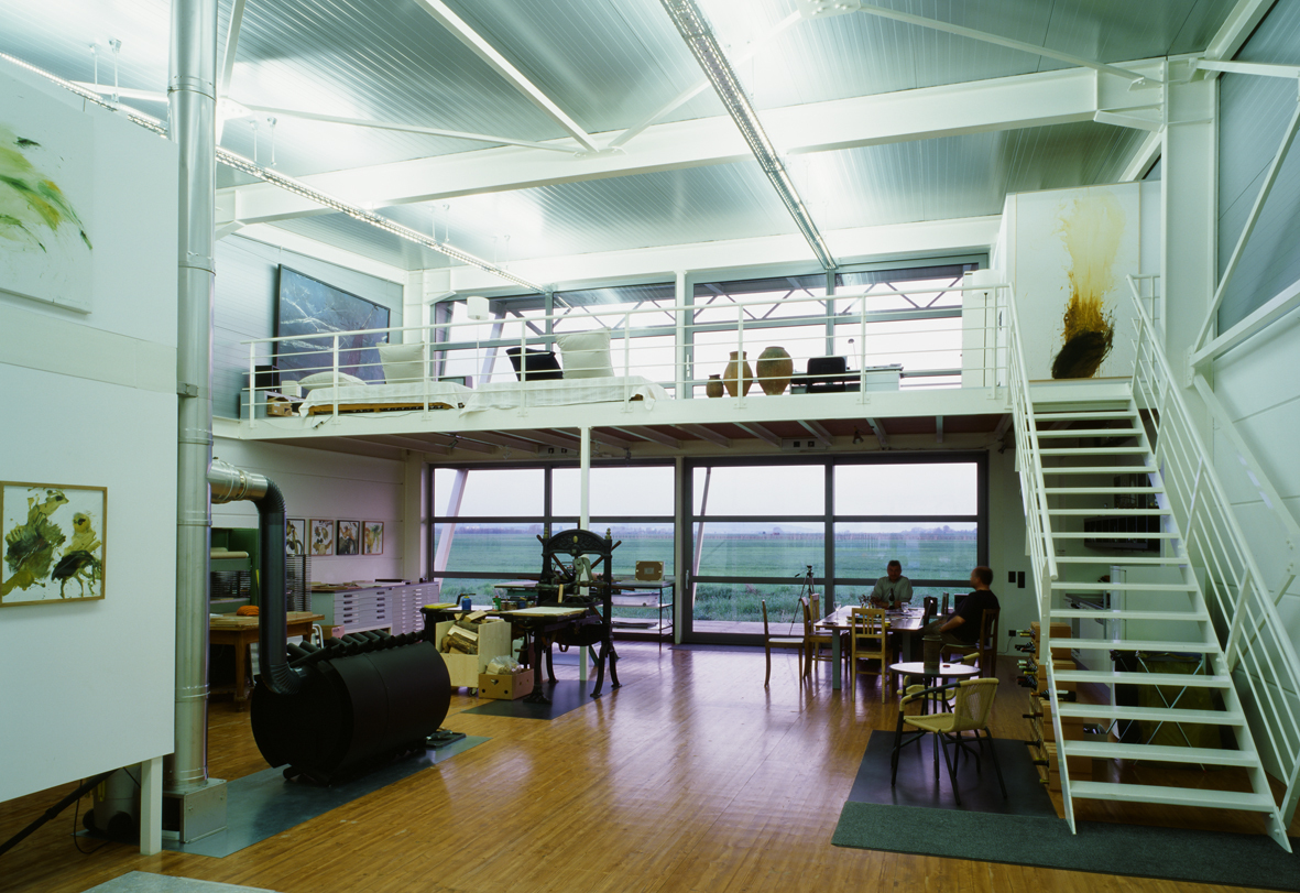 Stirnseiten verglast. Die Chiffre „Talstation“ ist eine kaum ironisch gemeinte Selbstdefinition. Die Werkstatt des Künstlers ist eben die Plattform zum Absprung von der realen in die reflektierte Welt und zurück, und sie ist so pur gebaut wie Ramsauers große Druckpressen oder die Motorräder und Segelboote, die Künstler und Architekt gleichermaßen lieben. Text: Otto Kapfinger