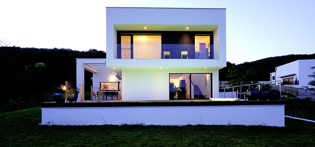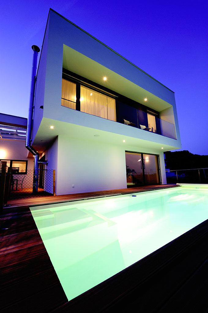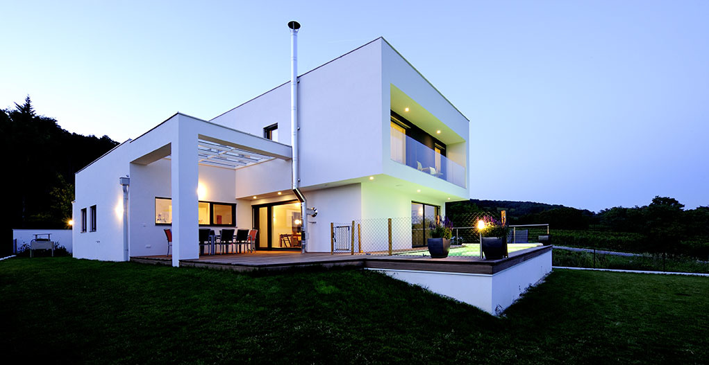 Die äußere Erscheinung des Hauses ist schlicht und konzentriert: Weiß verputzte Wände werden durch Eckverglasungen sowie durch größere Glasflächen allseitig strukturiert. Im Bereich des Wohnhofes gliedern aneinander gereihte Türen mit vorgesetzten Lamellentüren zur Verschattung die Fassade des Wohnhofes. Ein elegantes Spiel mit Licht und Schatten umgibt das Haus mit dem Lauf der Sonne. Die bauphysikalische Ausbildung des Hauses erfolgt im Niedrigenergie - Standard. Das Wohnhaus verschmilzt mit dem Garten und der weiteren Umgebung zu einem Ganzen und verkörpert das Lebensgefühl unserer Zeit. Text: Architekt