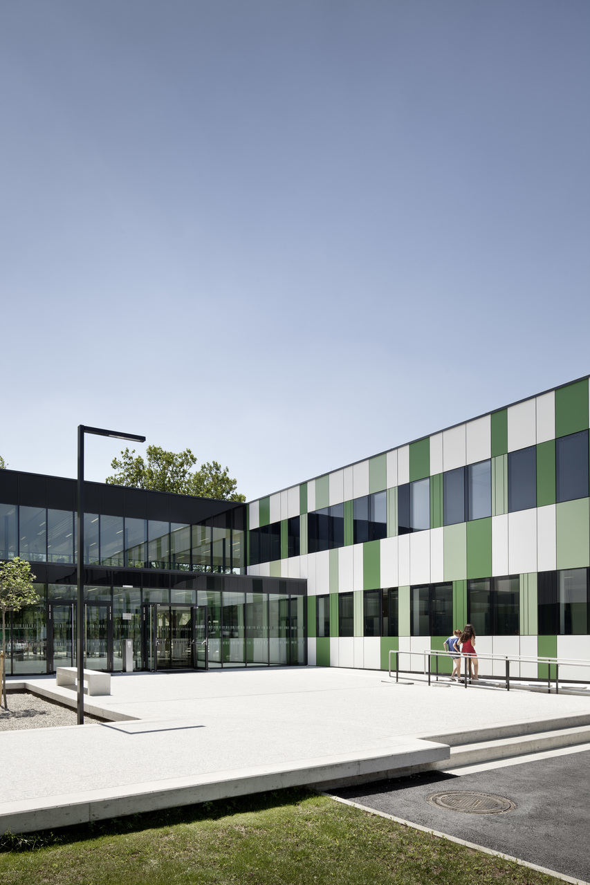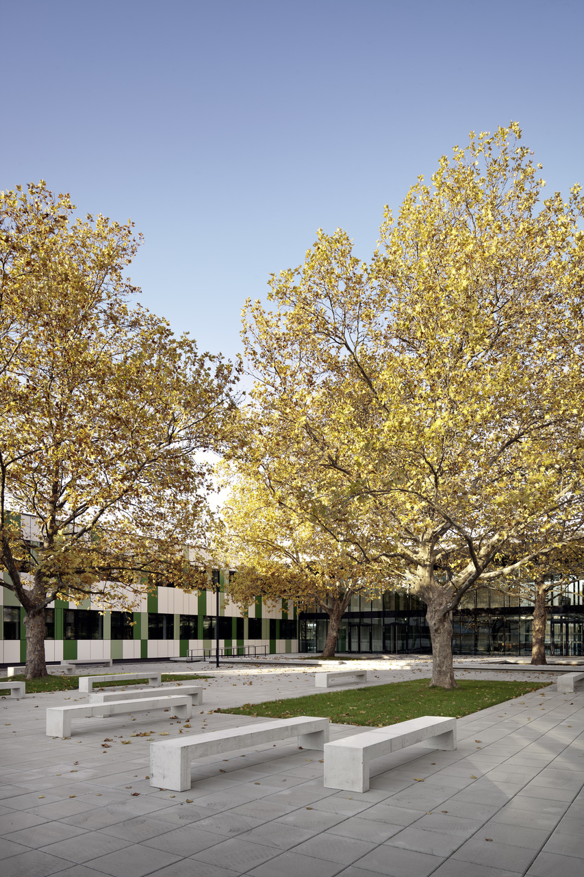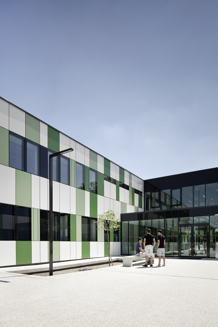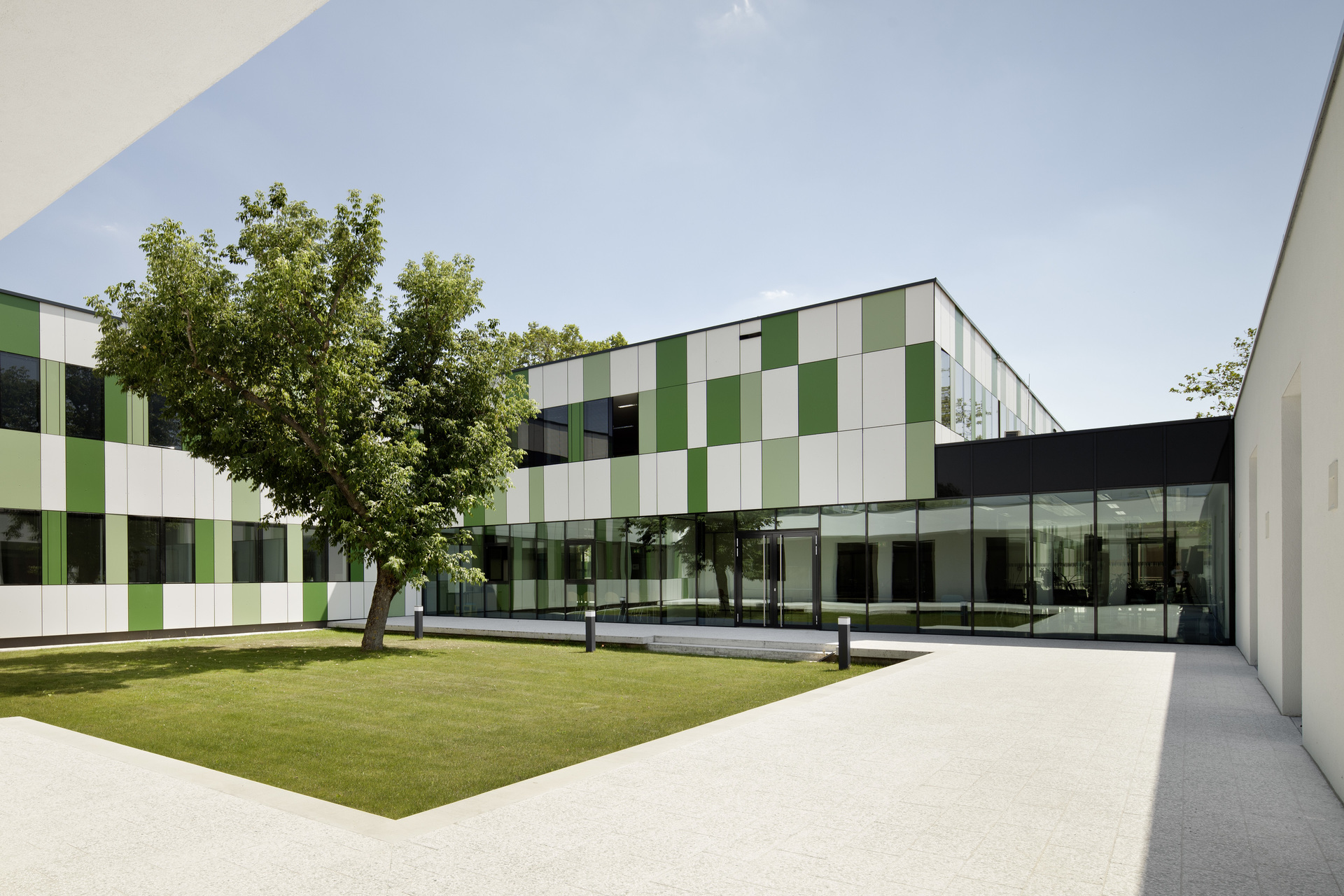 Das Farbkonzept für das Gebäude nimmt den eindrucksvollen Baumbestand des Grundstückes auf. Angelehnt an die Farben der großen Platanen im Pausenhof dominieren die Farben Grün, Beige und Weiß. (Text: Architekt)