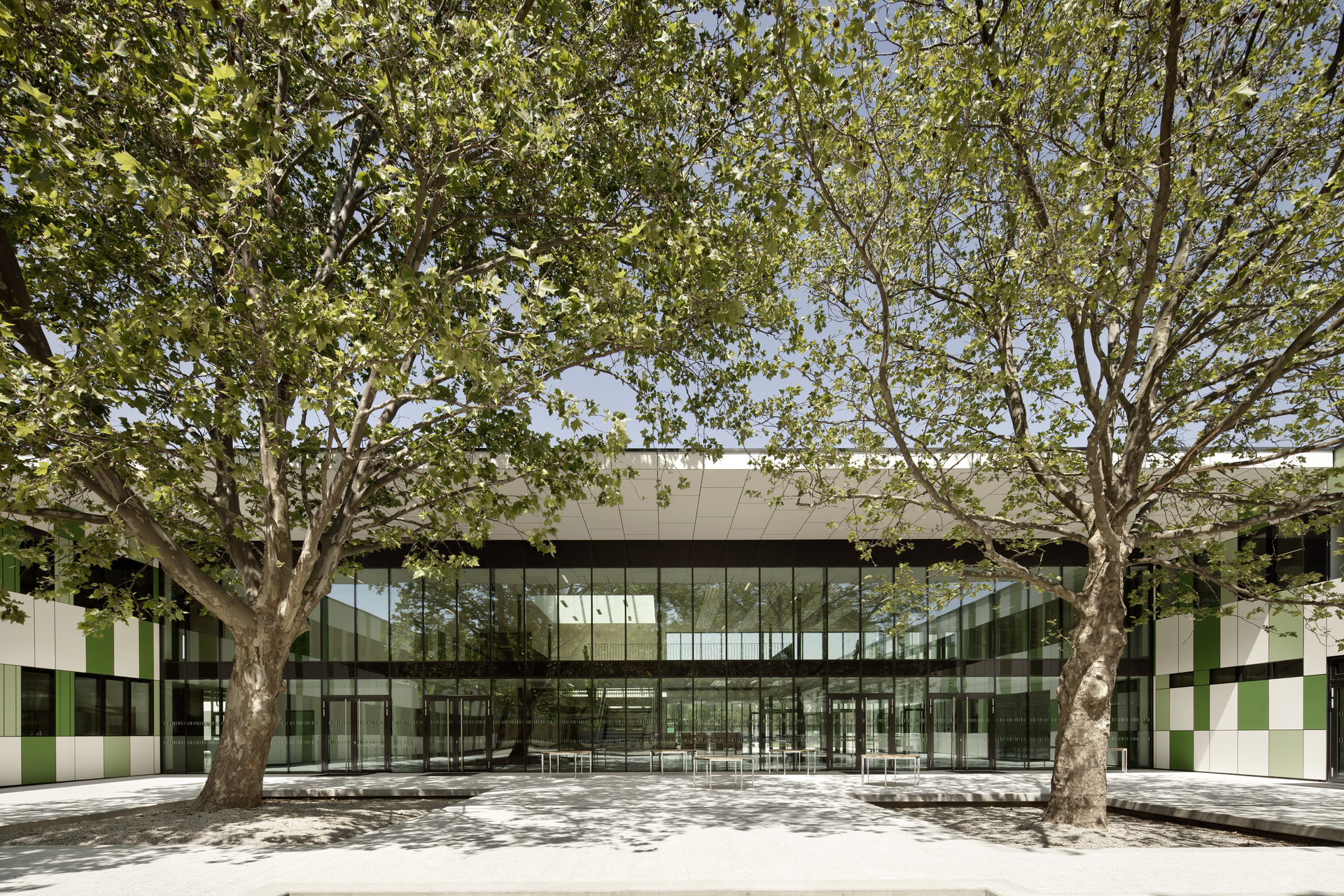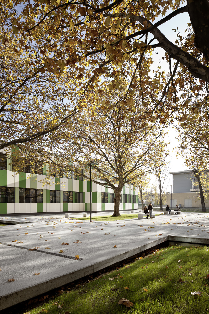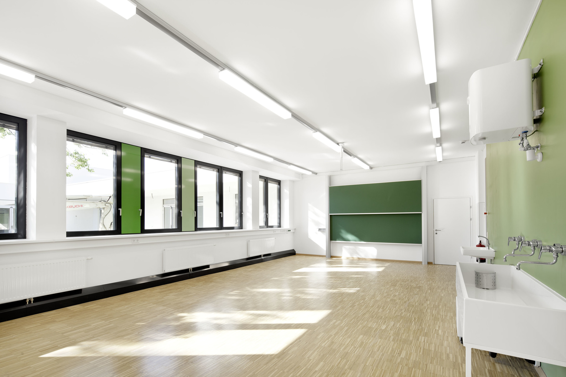 Das Farbkonzept für das Gebäude nimmt den eindrucksvollen Baumbestand des Grundstückes auf. Angelehnt an die Farben der großen Platanen im Pausenhof dominieren die Farben Grün, Beige und Weiß. (Text: Architekt)