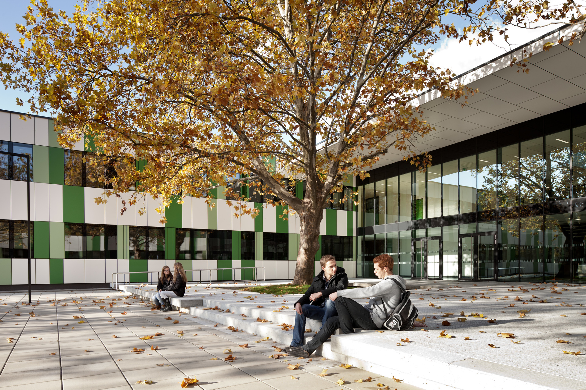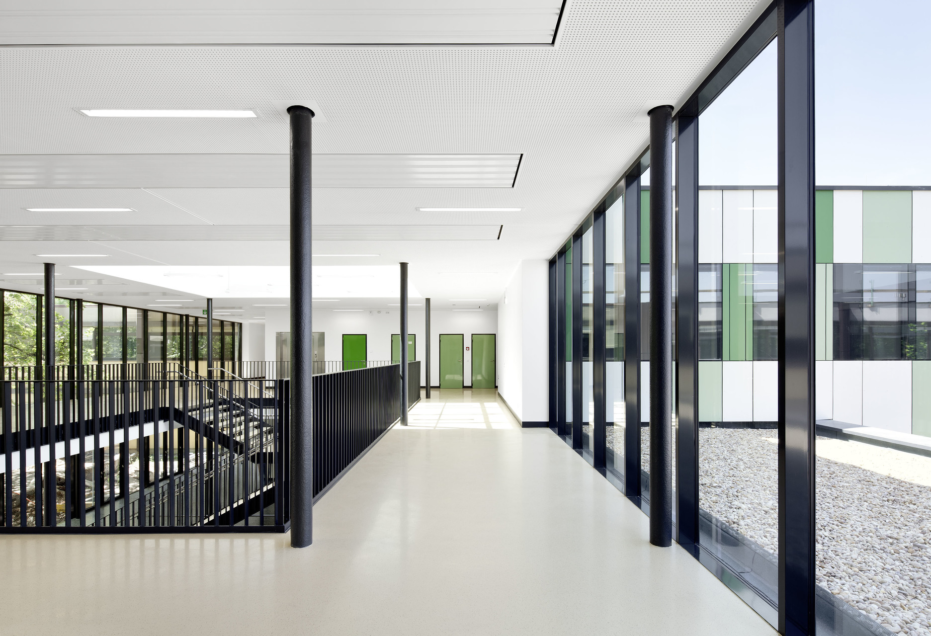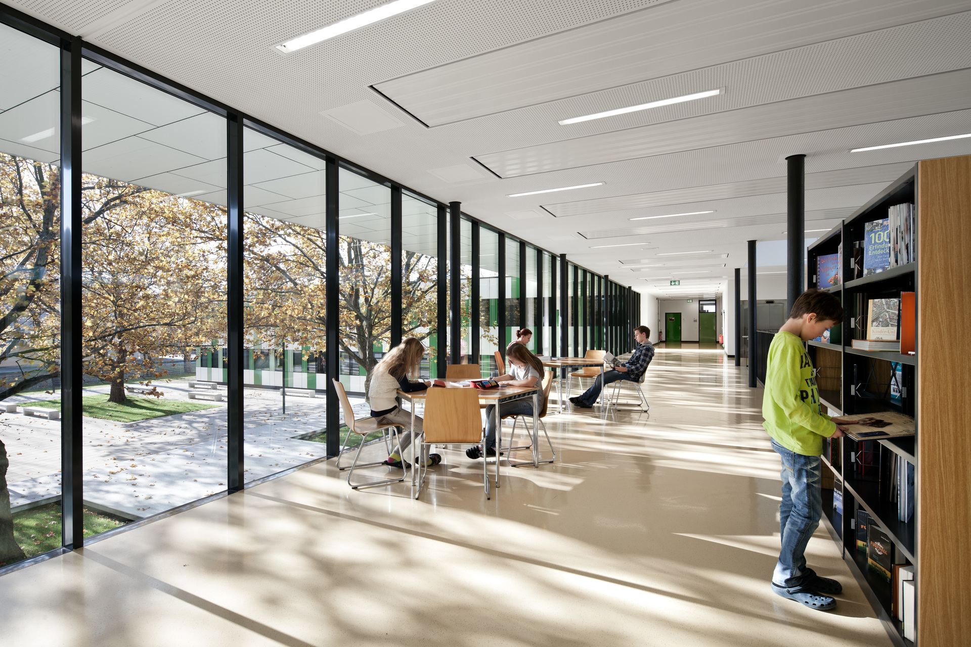 Der offene, transparente Verbindungstrakt mit den Pausenflächen ergänzt die bestehenden, kompakten und eher introvertierten Klassentrakte. Durch den extrovertierten, zu den Freiräumen hin ausgerichteten Mittelteil erhöht sich die Überschaubarkeit des Schulkomplexes. Die öffentlich genutzten Bereiche und Pausenflächen sind in direktem Bezug zu den Außenräumen angelegt.