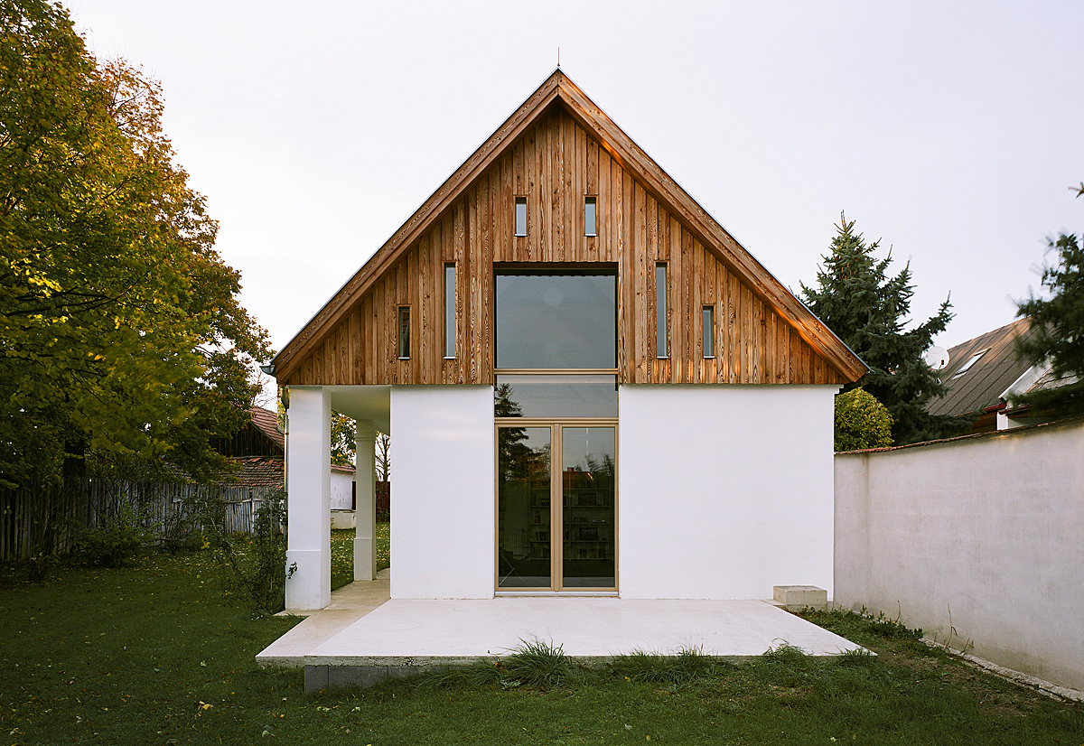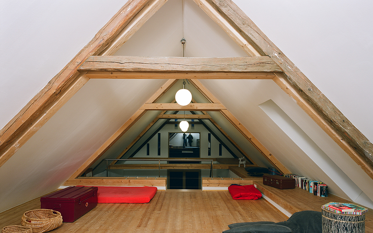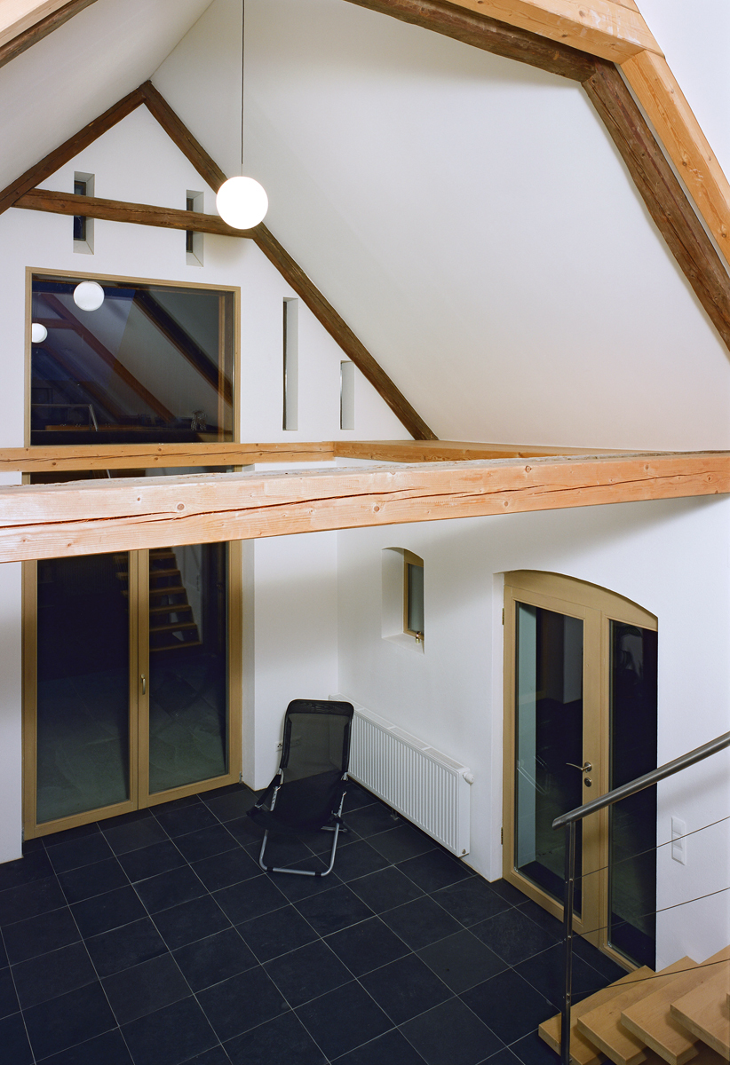 war und für die in den 50er Jahren aufgebrachte Sparziegeldeckung zu schwach dimensioniert war, wurde durch zusätzliche Gespärre und teilweisen Tausch der Pfetten erhöht, jedoch die Neigung des Bestandsdaches erhalten. Für die neue Eindeckung wurden die alten Dachziegel wiederverwendet. Die alte Tragkonstruktion wurde auch im Inneren des ausgebauten Dachbereichs sichtbar erhalten und tritt mit den roh belassenen, aus Holzriegeln und -Sparren bestehenden Verstärkungen und einer aus Sichtbeton bestehenden Zugband-Auswechslung in einen Dialog Alt-Neu.