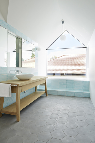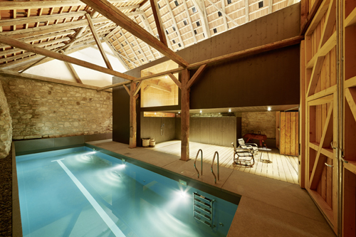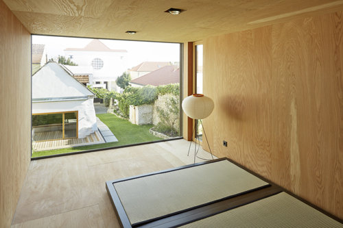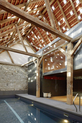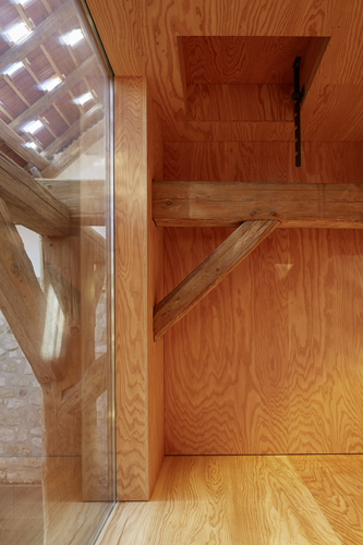 Aus der entkernten Scheune, deren gesamte Vorderfront geöffnet werden kann und die u.a. ein Schwimmbassin beherbergt, ragt eine Box in Holzriegelbauweise mit einer Verkleidung aus anthrazitfarbenen Dreischichtplatten. Im Inneren wurde sie vollständig mit Kistensperrholz ausgekleidet, wobei das Gebälk des alten Dachstuhls sichtbar vor den Wandscheiben liegt.