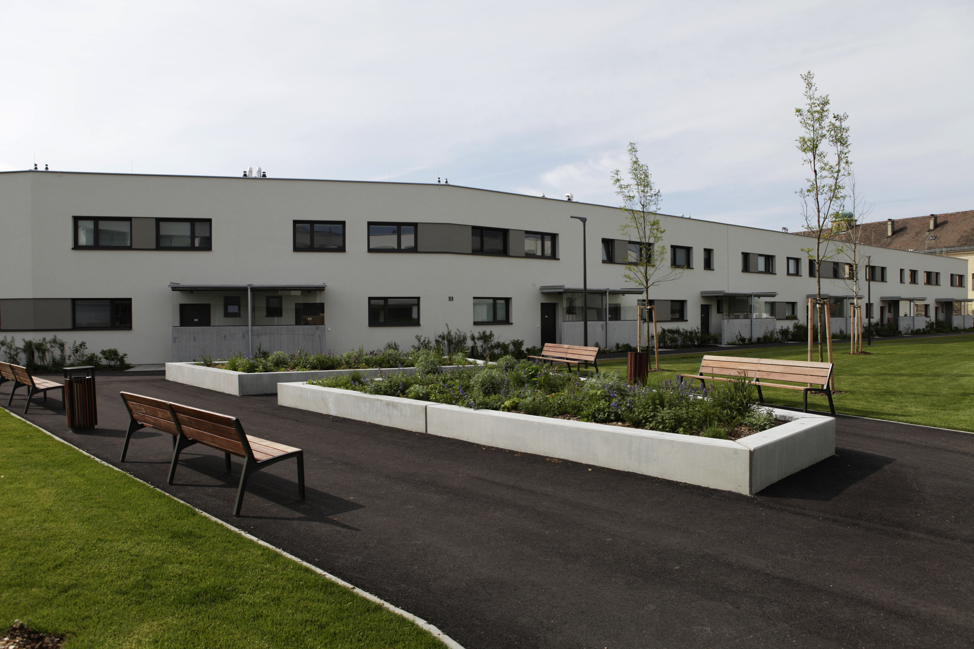 Orte der Kommunikation: Das Sitzen und Tratschen am „Bankerl vorm Haus“ hat im Burgenland eine sehr lange Tradition. Auch heutzutage gibt es diese Nutzungsansprüche - jedoch eben nicht mehr an der Durchzugsstraße des Ortes, sondern wie hier, im Hof einer neuen Wohnhausanlage. In einem Sichtbetonbecken mit pannonischer Flora widerspiegeln heimische, identitätsstiftende Stauden und Kräuter den Lauf der Jahreszeiten und geben dem Ort seinen eigenen unverwechselbaren Charakter.