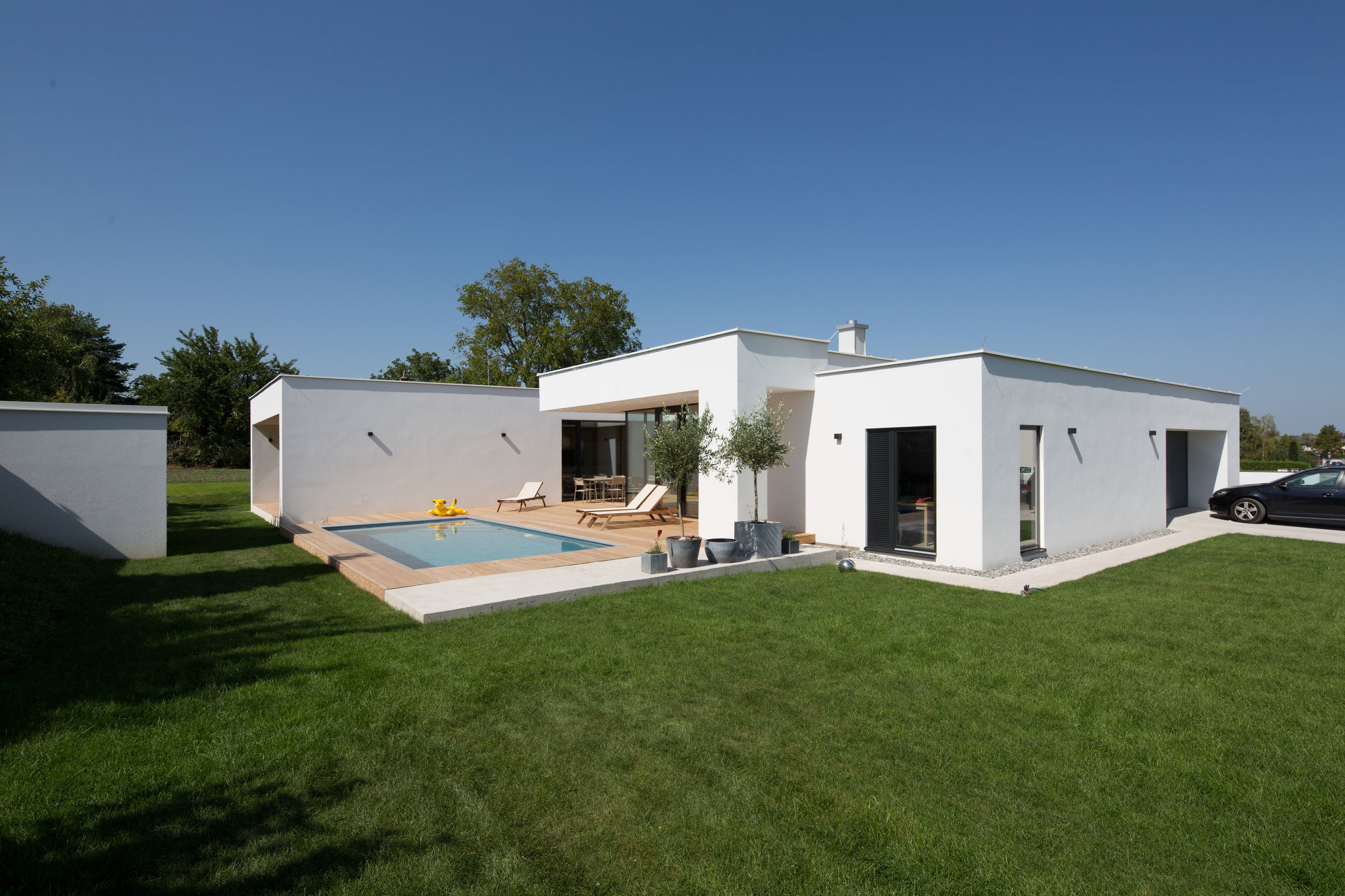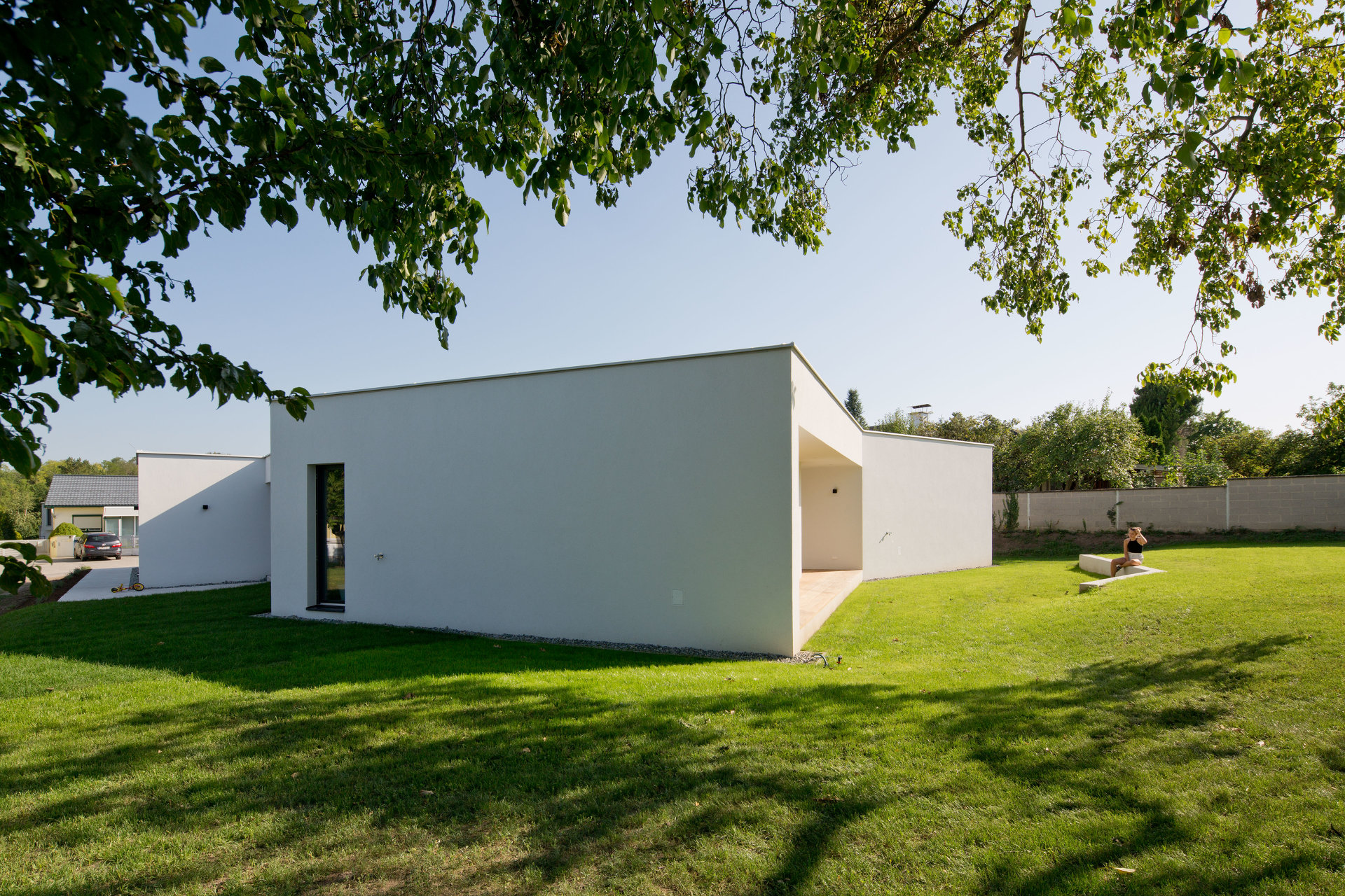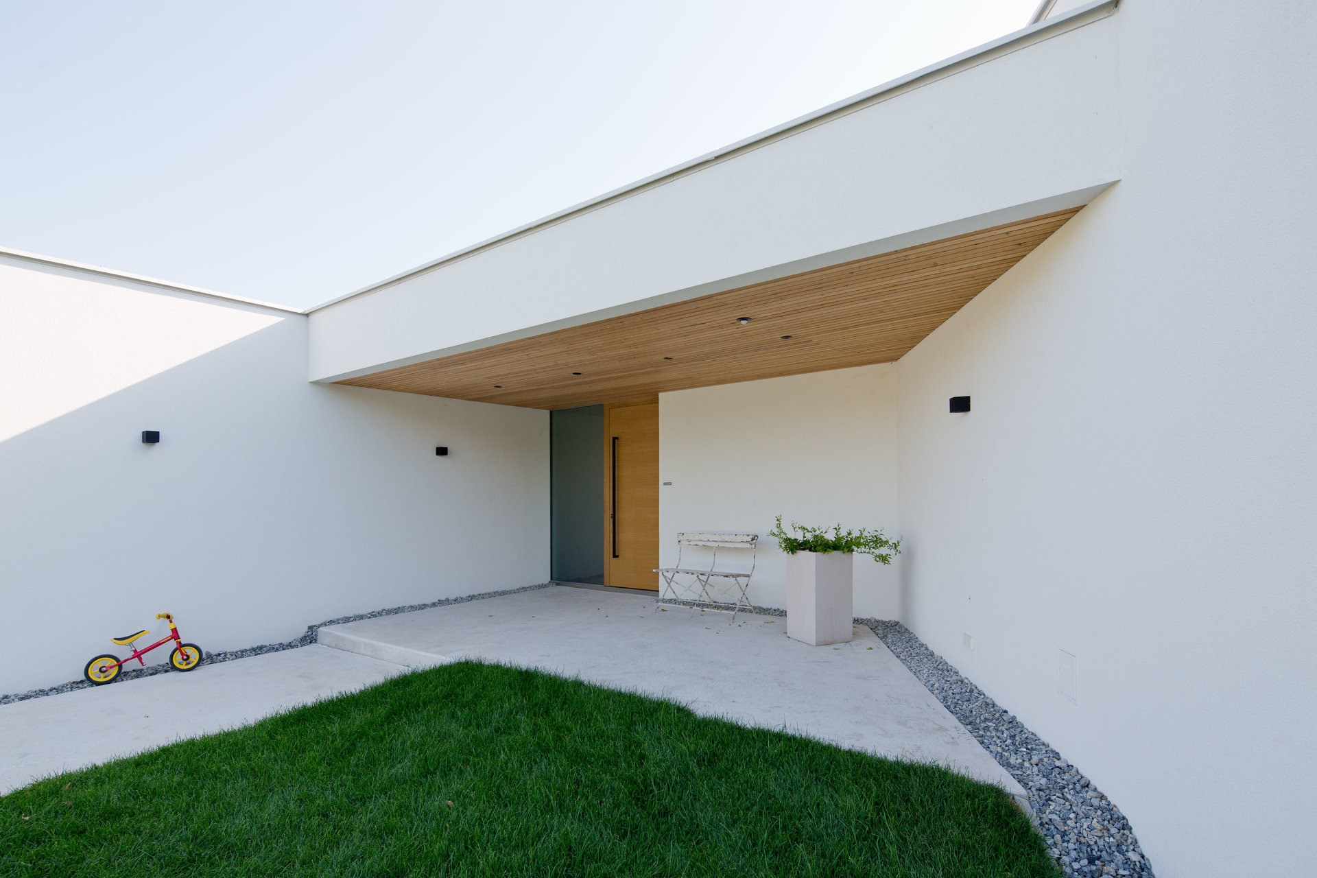 Das Haus ist organisiert wie ein Dorf: Von der Straße kommend passiert man zuerst die „Peripherie“ - Garage und Technik-, beziehungsweise Lagerbereich, die das Zentrum von außen abschirmt. Entlang der „Stadtmauer“ erreicht man den sich freundlich öffnenden, überdachten Eingang.Umrundet man das Haus nun im Uhrzeigersinn, gelangt man – an der vorderen Spielwiese und am Pool vorbei - hin zum „Gasthaus“ – der Wohnküche, die sich über zwei Seiten voll verglast zum Schanigarten – der Terrasse – hin orientiert.