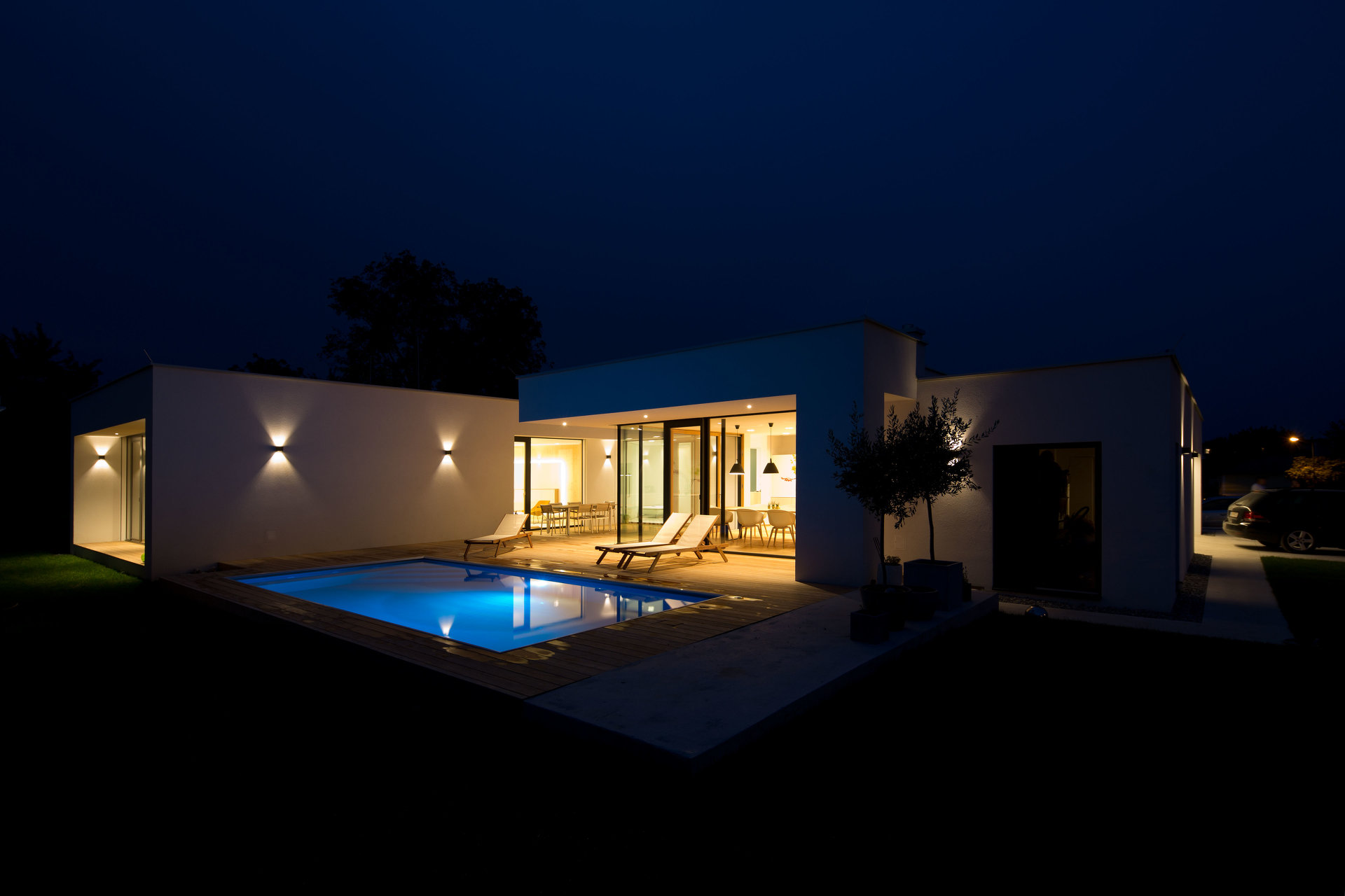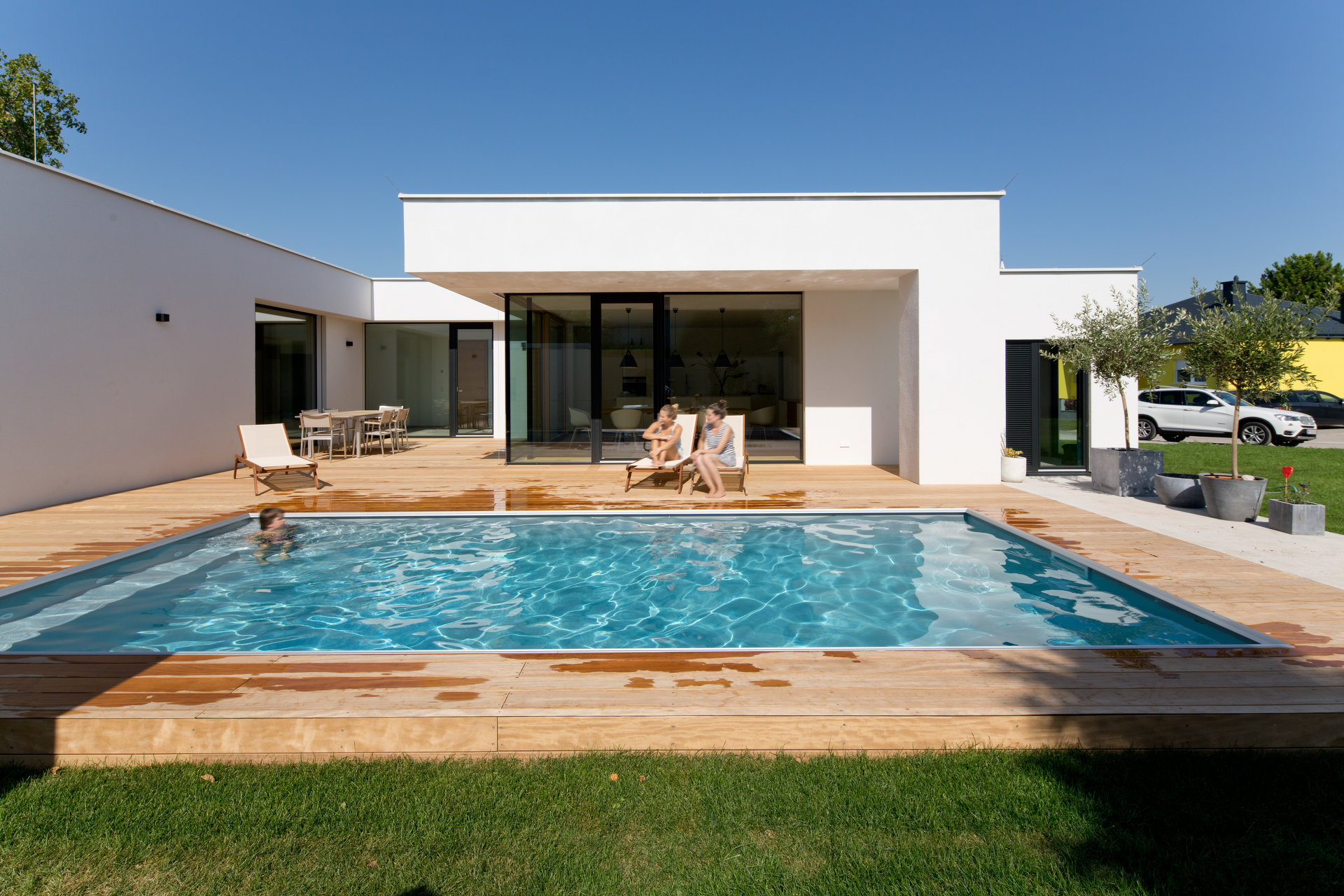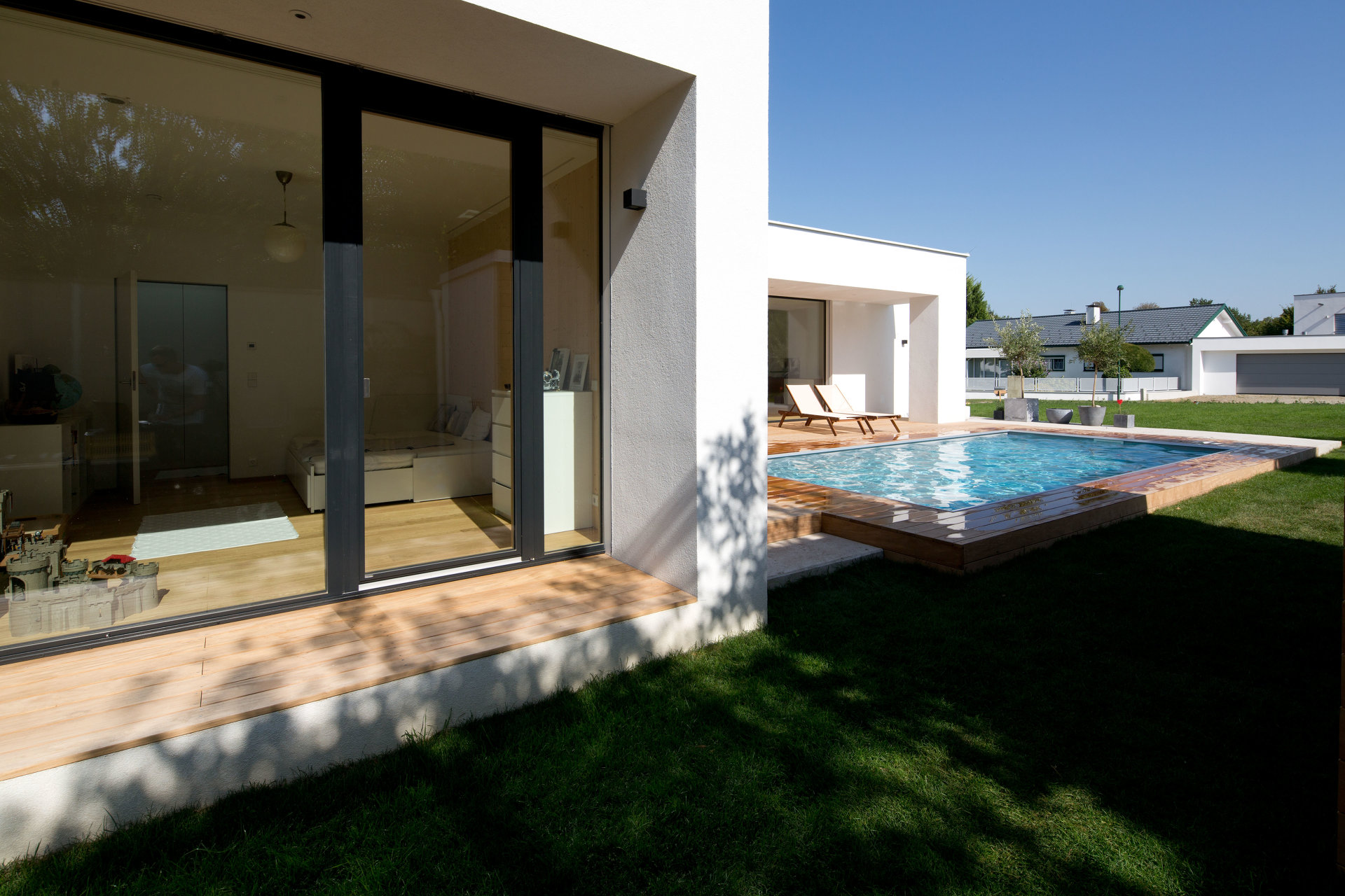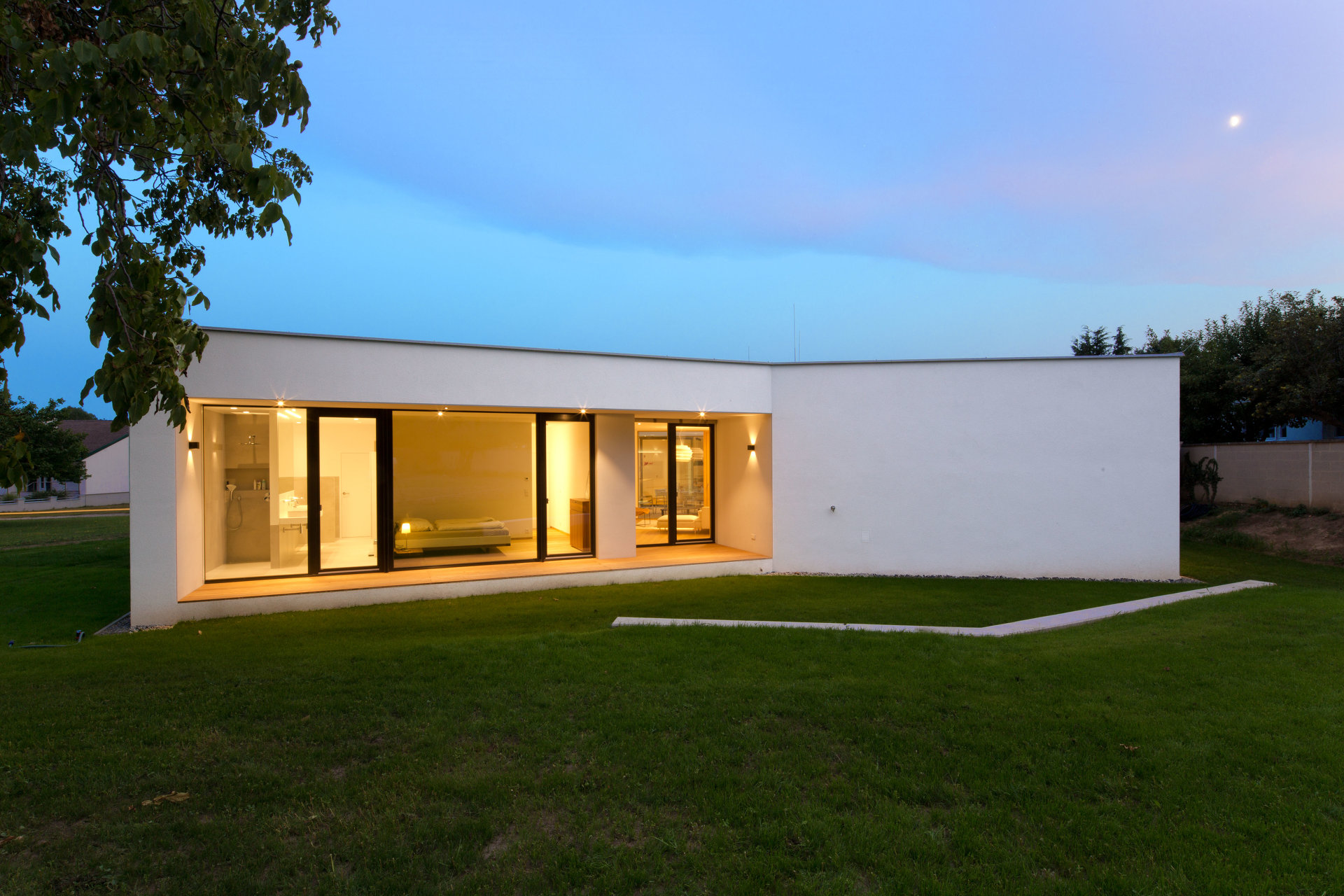Das Haus ist organisiert wie ein Dorf: Von der Straße kommend passiert man zuerst die „Peripherie“ - Garage und Technik-, beziehungsweise Lagerbereich, die das Zentrum von außen abschirmt. Entlang der „Stadtmauer“ erreicht man den sich freundlich öffnenden, überdachten Eingang.Umrundet man das Haus nun im Uhrzeigersinn, gelangt man – an der vorderen Spielwiese und am Pool vorbei - hin zum „Gasthaus“ – der Wohnküche, die sich über zwei Seiten voll verglast zum Schanigarten – der Terrasse – hin orientiert.