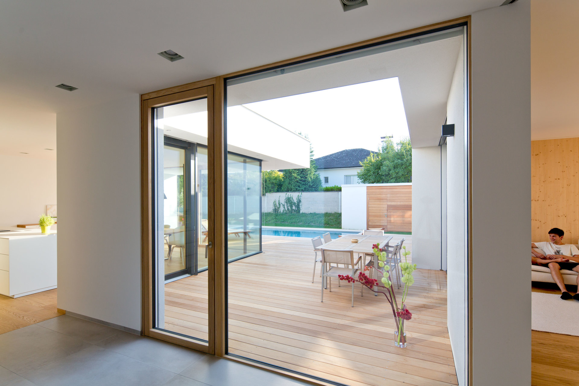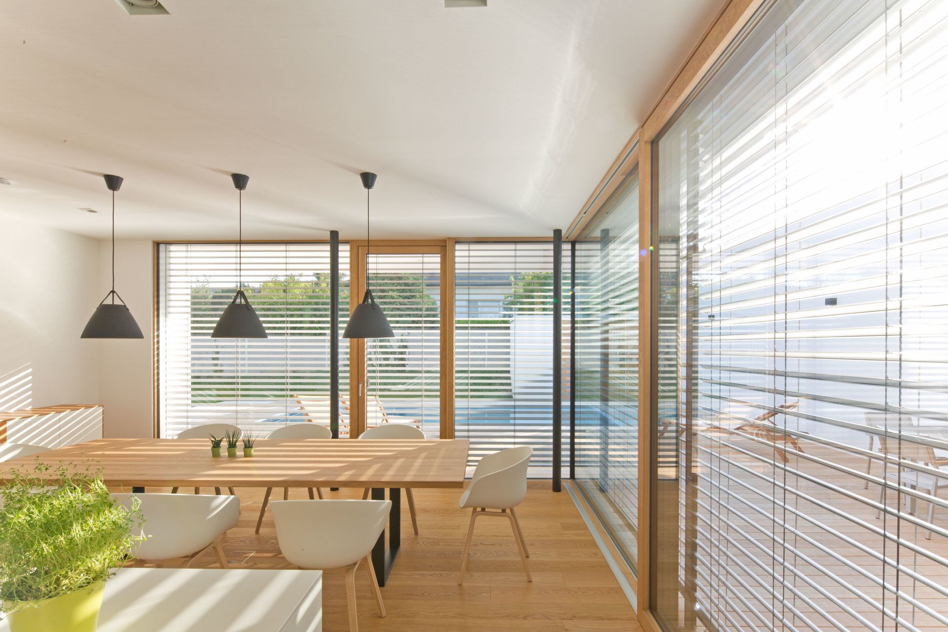 Schon beim Betreten des Gebäudes wird man überrascht, wie radikal sich das Haus zu den Freibereichen hin öffnet. Man befindet sich sofort im Zentrum des Hauses – und schon fast wieder auf der Terrasse - das ganze Atrium samt Pool im Blickfeld;