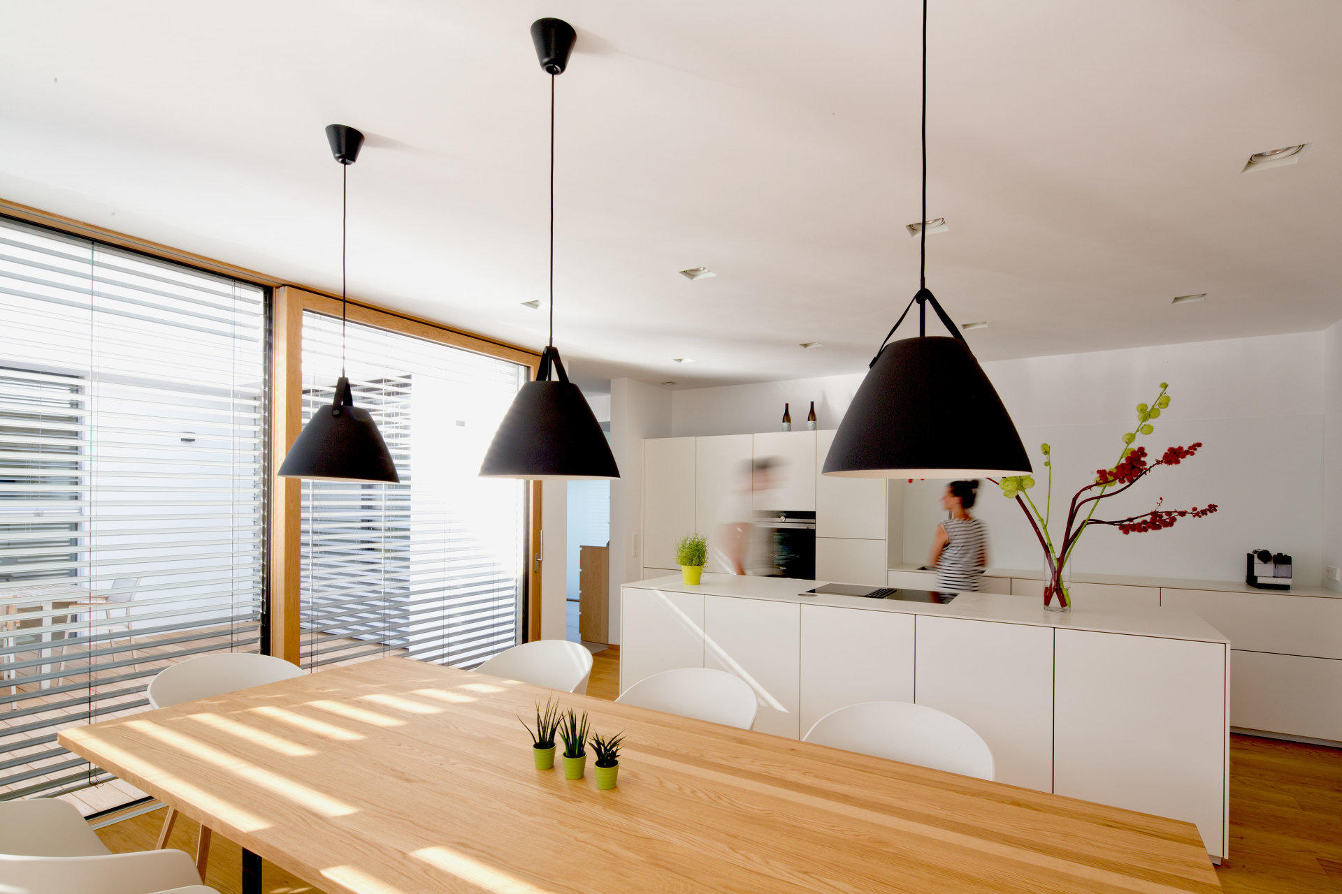 Im vorderen Bereich des Hauses findet das gesellschaftliche Leben der gastfreundlichen Bauherrnfamilie statt – der große, drei Meter lange Eichentisch ist holzgewordene Einladung an Familie und Freunde.