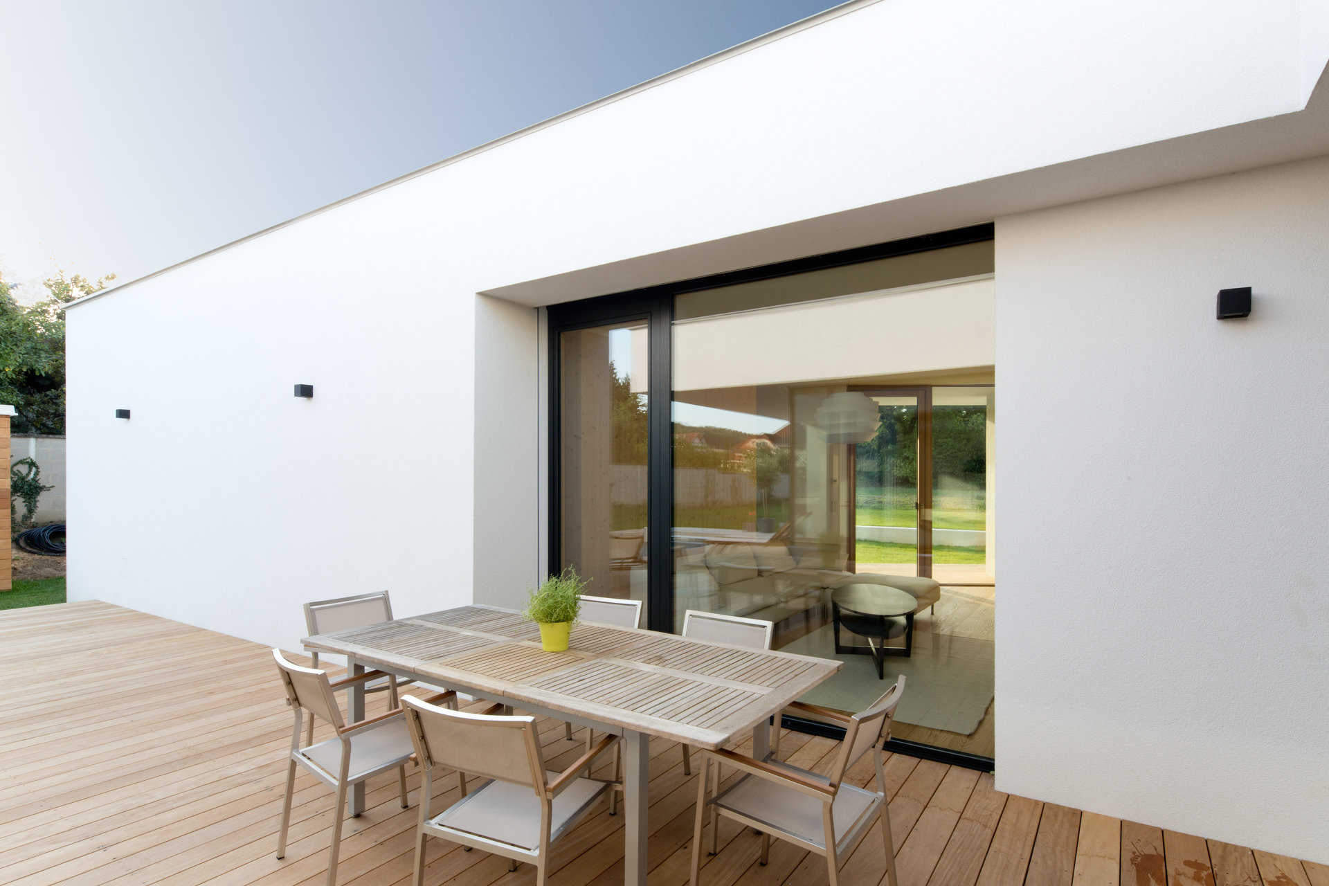 Einerseits bildet die Abfolge von Wohnküche-Atrium-Wohnzimmer-Terrasse ein Raumkontinuum, führt vom „öffentlicheren“ Teil des Gartens und des Hauses bis zum privaten Garten im hinteren Bereich, andererseits definiert jedes „Haus“ seinen eigenen Freibereich im Garten – mit eigener Atmosphäre und nicht einsichtig von den jeweils anderen „Häusern“.