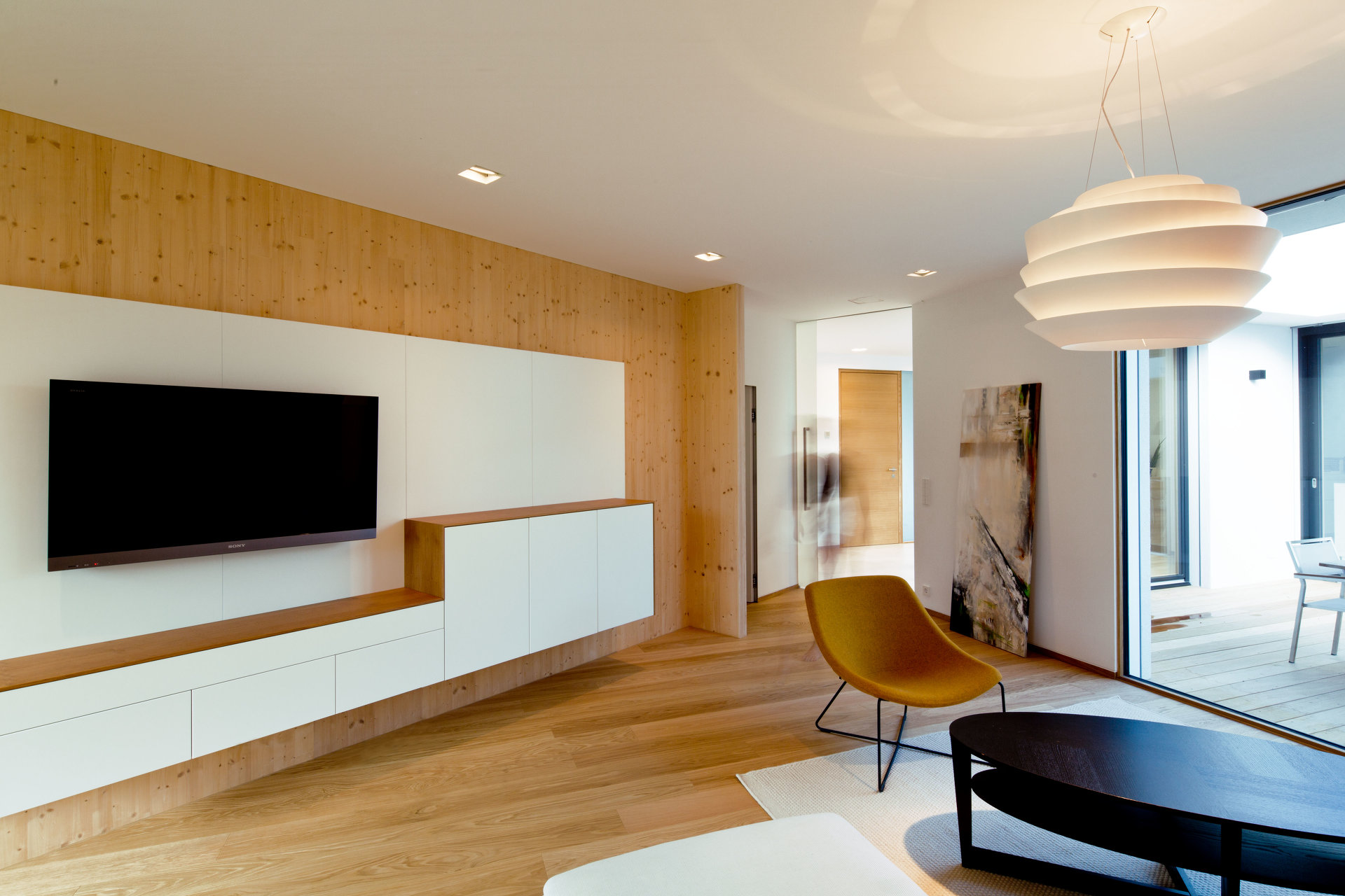 Zwischen Kinder- und Elternhaus wird als gemeinsamer Marktplatz das Wohnzimmer aufgespannt, Die Verdrehung des Elternhauses gibt dem Wohnzimmer einen spannenden Twist. Das Wohnzimmer ist über raumhohe Verglasungen sowohl zum Atrium als auch zum privaten Garten hin orientiert und stellt so die innere Verbindung der verschieden Außenbereiche dar.