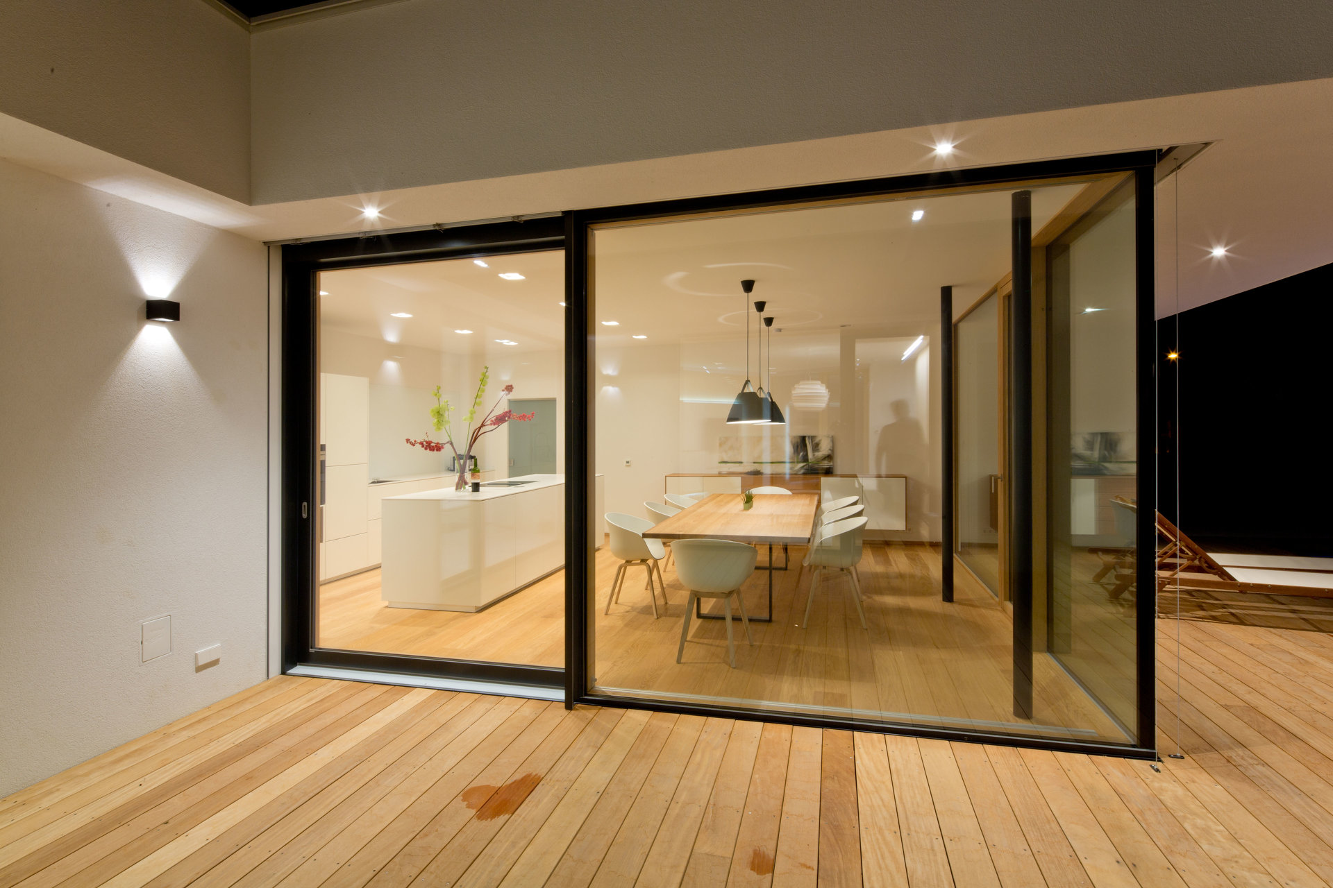 Das Atrium bringt Licht in die Tiefen des Hauses, unterteilt das Haus in Zonen und verbindet diese Zonen wieder miteinander, erlaubt eine zweiseitige Ausrichtung der Wohnküche mit natürlicher Belichtung zur jeder Tageszeit, sowie eine zweiseitige Belichtung des Wohnzimmers.