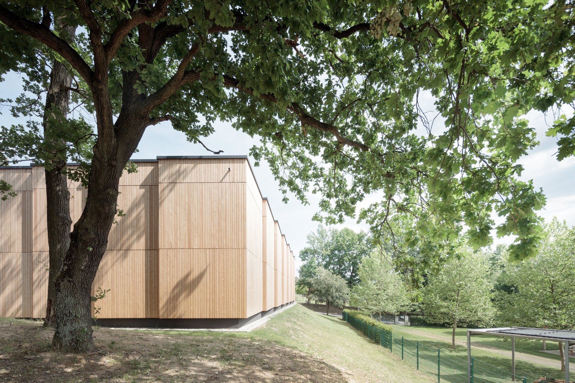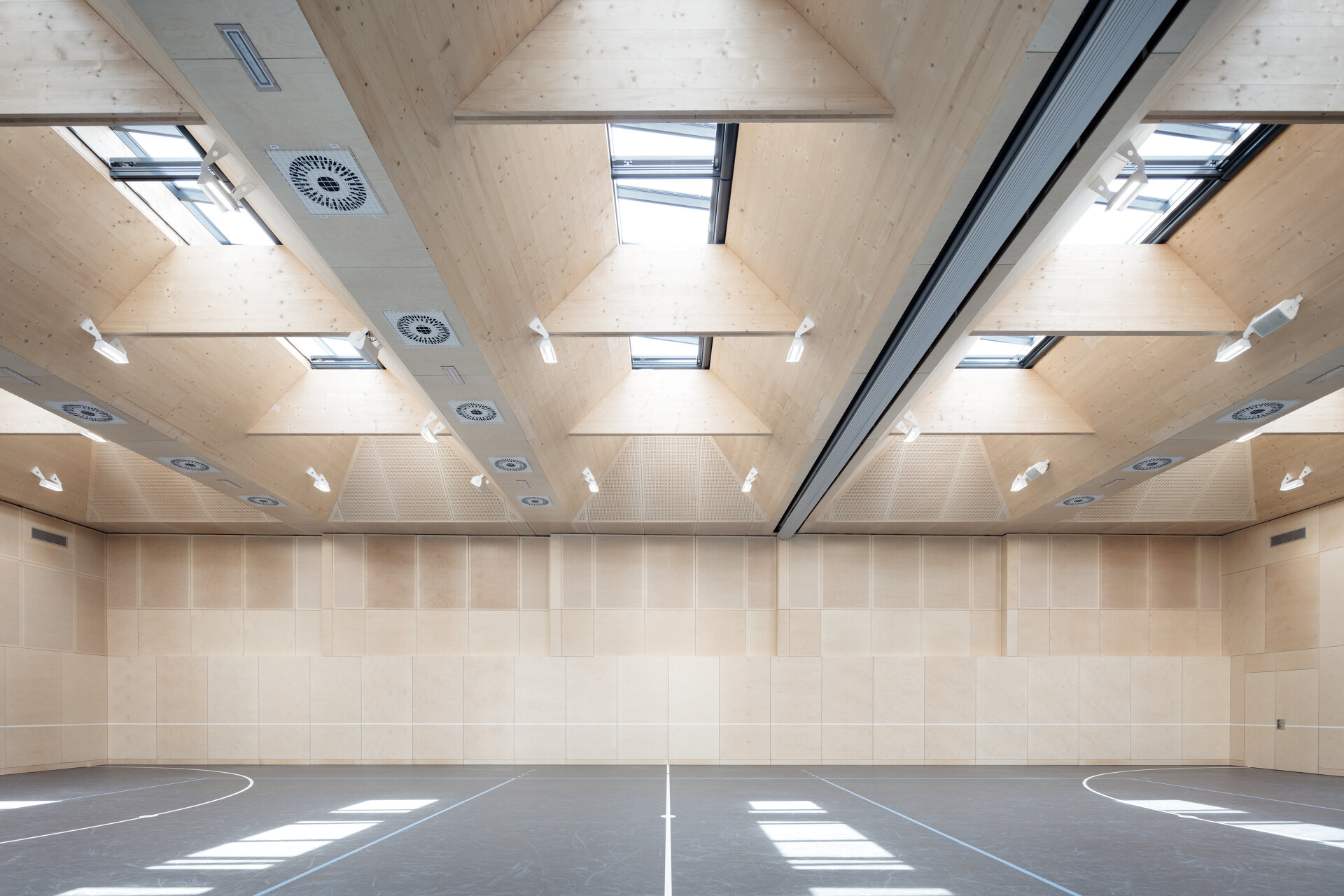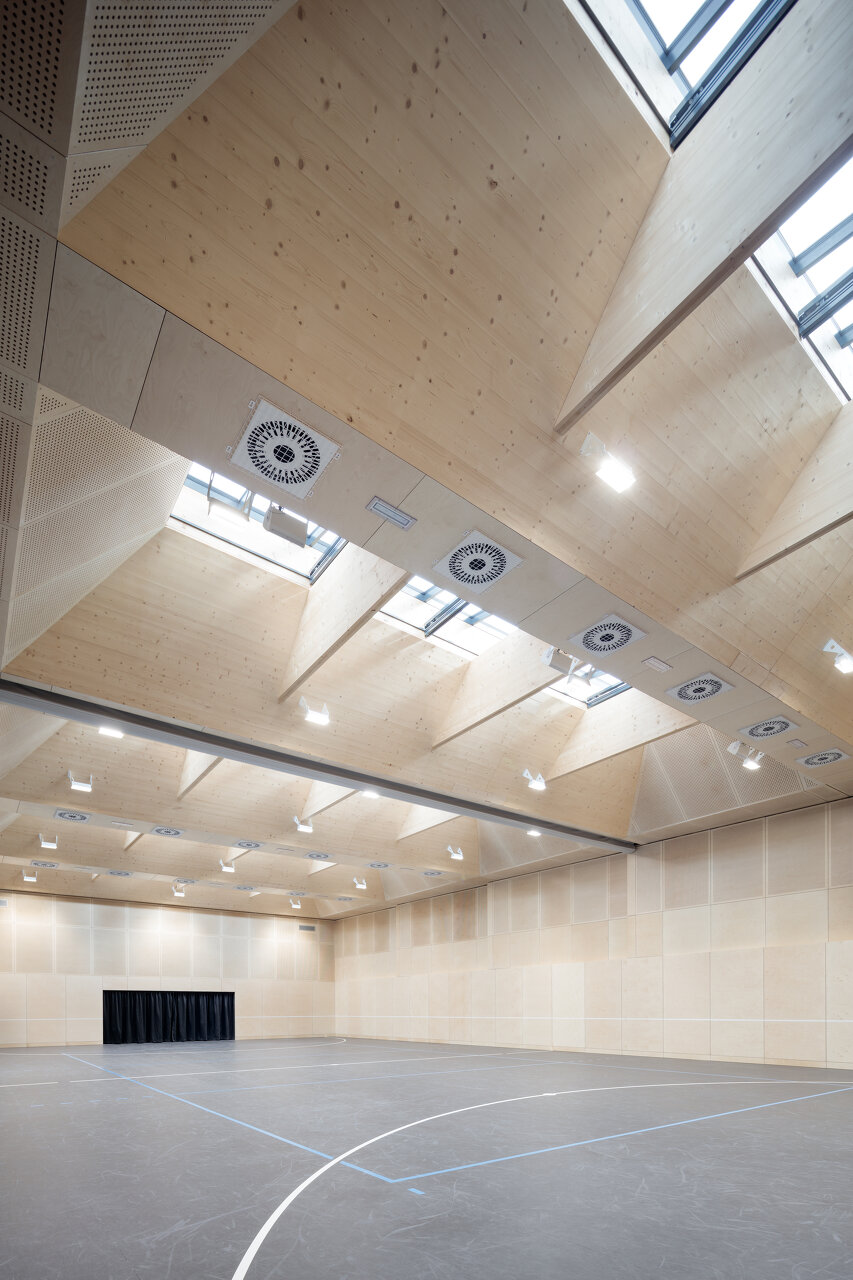 Die Technikräume und Garderoben aus Brettsperrholz liegen an den beiden Stirnseiten des Gebäudes und werden vom freitragenden Dach überspannt. Dieses wurde als Shedkonstruktion ebenfalls aus Brettsperrholz konstruiert und die einzelnen Elemente auf der Baustelle vorgefertigt. Insgesamt überspannen fünf Sheds die Halle, welche nacheinander auf die lastabtragenden längsspannenden Brettschichtholzträger gehoben wurden. So konnte der gesamte Holzbau in nur drei Wochen errichtet werden. Die Stützen sind 20cm breit, 40cm tief und in einem Abstand von etwa 5,5 m angeordnet. Das Dach überspannt eine Länge von 18 m.