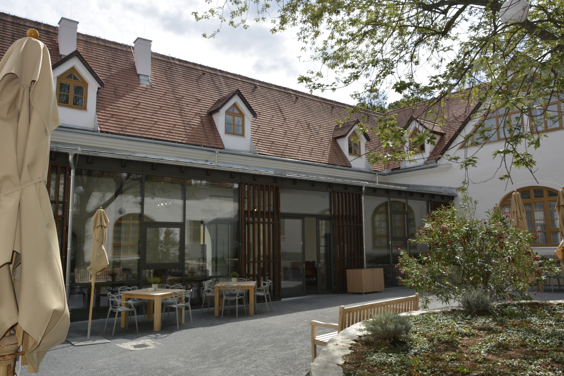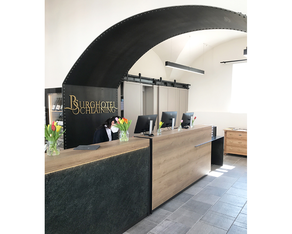 Als Haupteingang des Burghotels wurde das repräsentative Tor des ehemaligen Wirtschaftshof der Burg wieder aktiviert. Vor dem Hotel haben wir eine südseitige Sonnenterrasse mit direktem Blick zur Burg geschaffen. Unter diesem Terrassenzubau wurde die gesamte techn. Infrastruktur, Anlieferung und Entsorgung untergebracht und ermöglicht über eine Liftanlage eine direkte Anlieferung zur Küche. Der gesamte Innenhof wurde auf eine Ebene gebracht und ist jetzt barrierefrei zugänglich. Damit kann er in voller Größe, teils als beschatteter Gastgarten, teils als Veranstaltungsbereich genutzt werden. Das ehemalige Stüberl wurde zum Seminar- und Besprechungsraum umfunktioniert und um zwei weitere Besprechungsräume erweitert. Die Zimmer wurden vollkommen erneuert und mit neuen Bädern und Sanitäranlagen ausgestattet. (Text: Architekt:innen, bearbeitet)