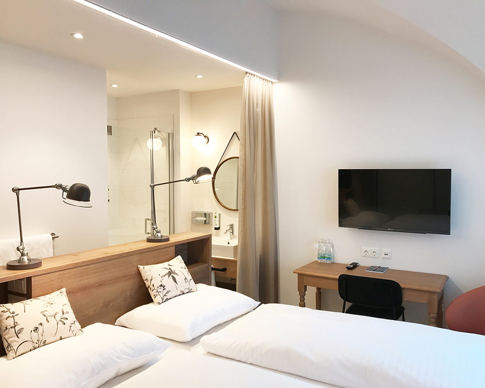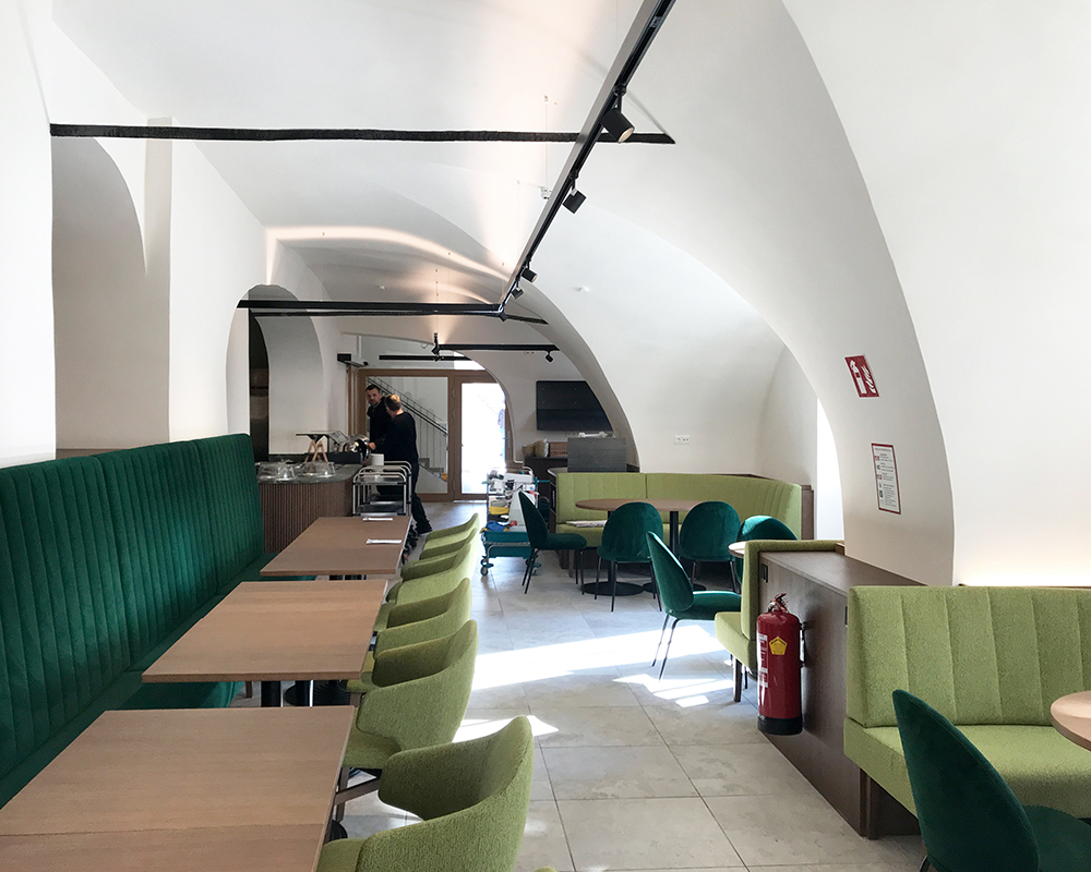 Das sanierte Hotel mit seinen 64 Zimmern wurde als 3*** Superior Hotel neu gestaltet. Wir haben die räumliche und geschichtliche Beziehung zum Tagungszentrum der Friedensburg Schlaining genutzt und erweitert. Unsere Umbauten ermöglichten es, auch die benachbarte ehemalige Synagoge als künftiges Veranstaltungszentrum in ein erweitertes Nutzungskonzept mit einzubeziehen. Dafür verlegten wir sämtliche öffentliche Funktionen des Hotels wie Rezeption, Lounge, Bar und Restaurant in den, der Synagoge benachbarten, Trakt.