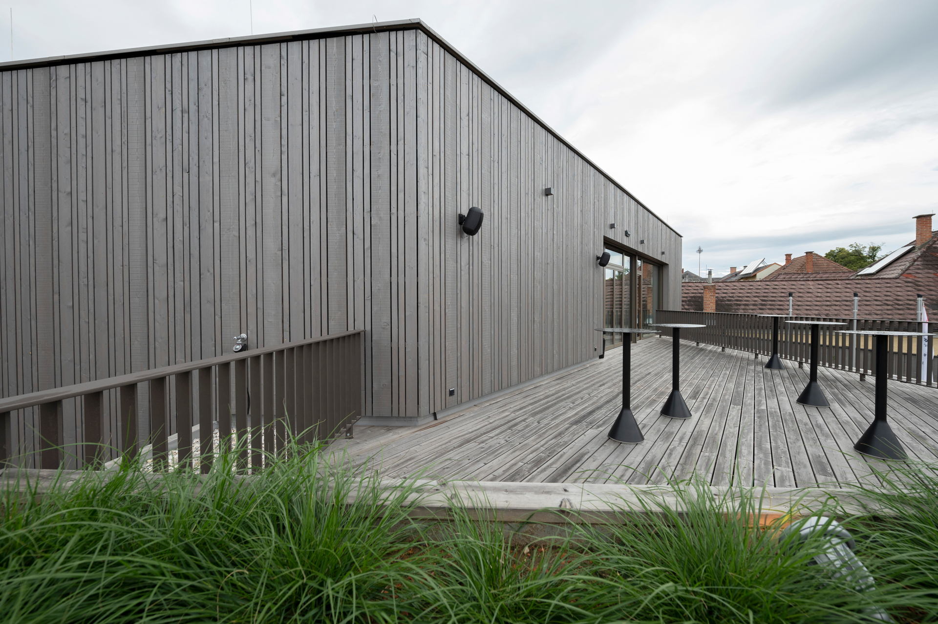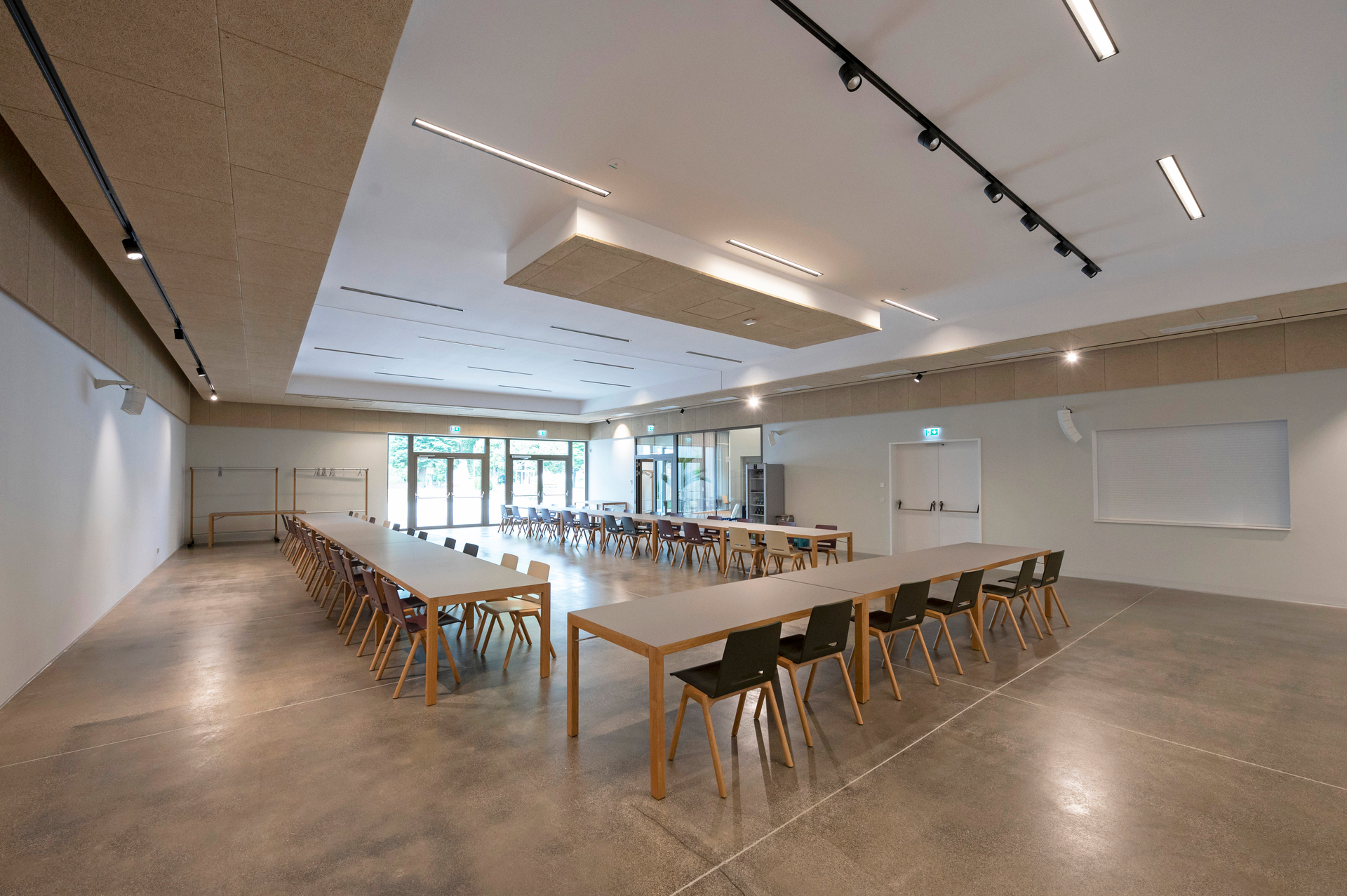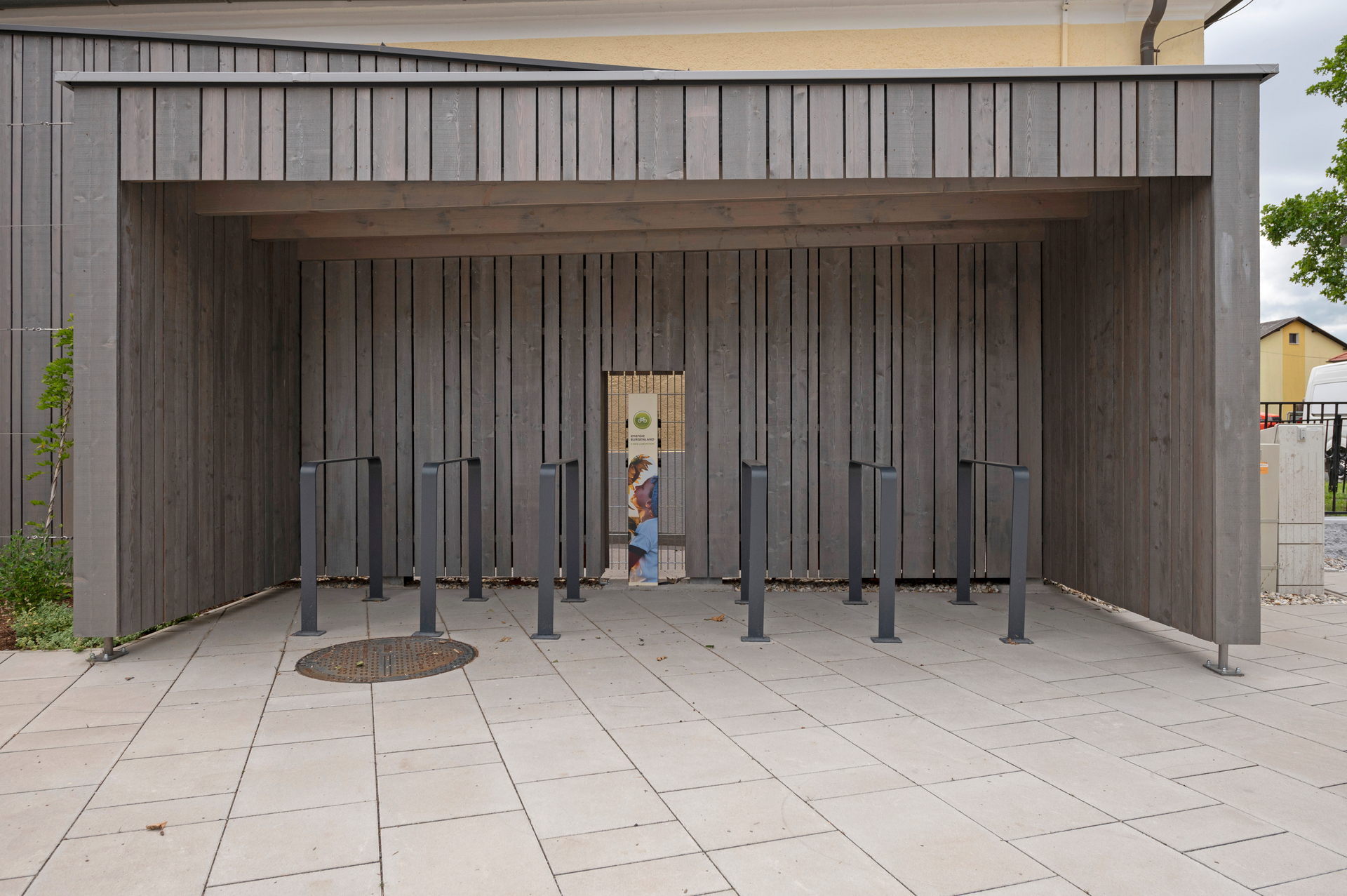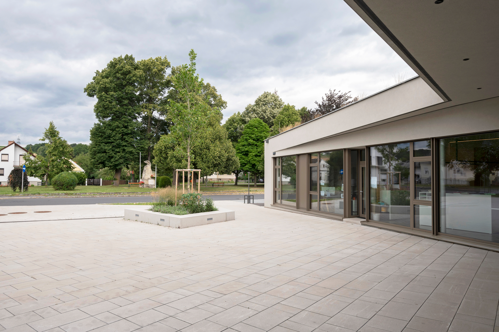 Durch die Positionierung der Baukörper entsteht ein zur Hauptstraße offener, Freiraum – der „Dorfplatz“. Die großzügige Öffnung des Veranstaltungssaales zum Dorfplatz ermöglicht eine erweiterte Bespielbarkeit. Der Dorfplatz als zentrales Element bildet gemeinsam mit der angrenzenden Parkanlage einen flexibel nutzbaren Ort. Für die Bepflanzung wurden ausschließlich ortstypische Sträucher und Bäume herangezogen. Diese dienen als Schattenspender und Witterungsschutz, bilden aber auch den Abschluss des Dorfplatzes zum nördlichen Nachbarn durch eine „Grüne Wand“. (Text: Architekt:innen)