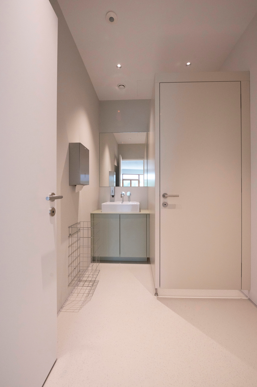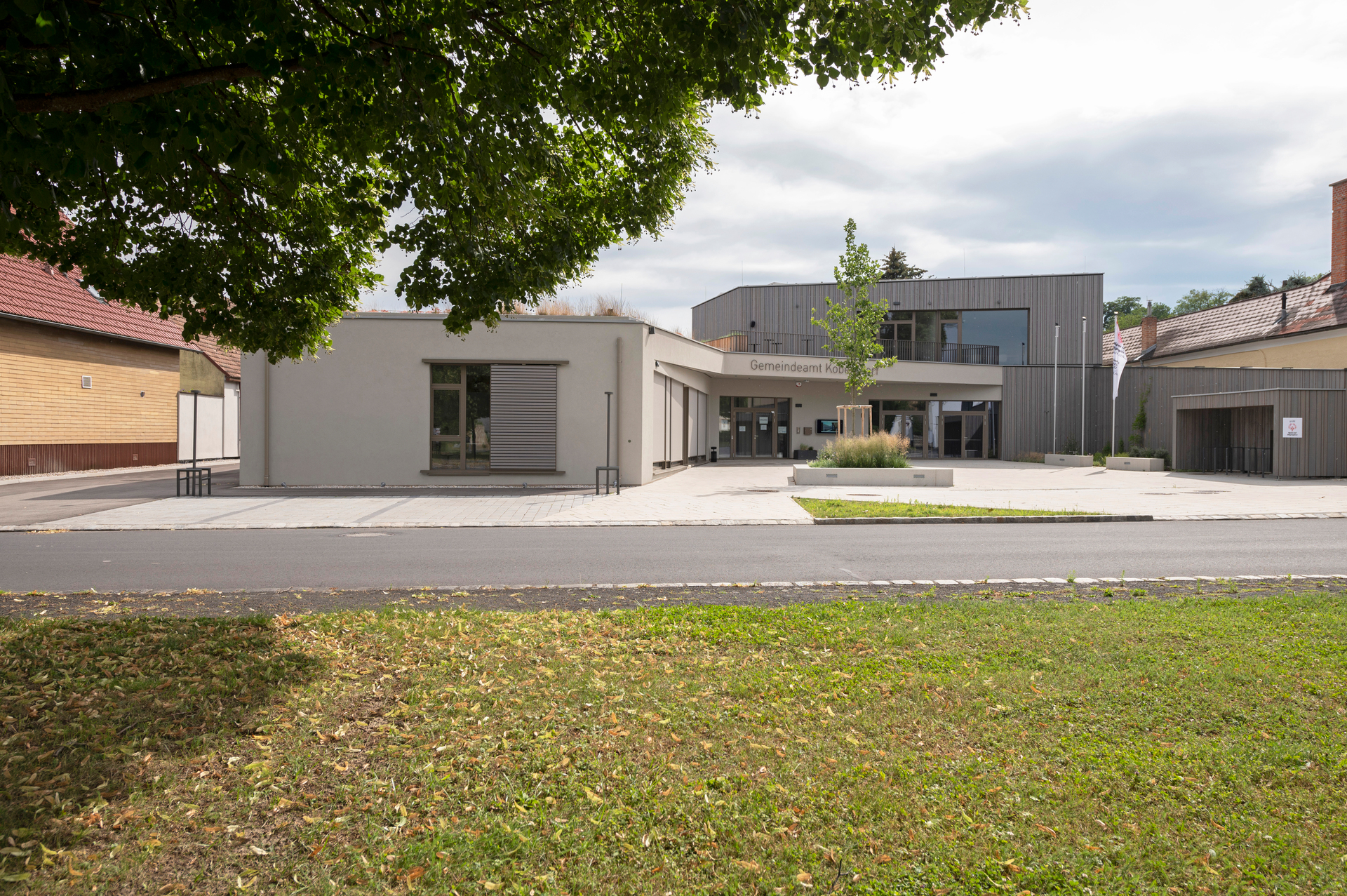Das „offene Gemeindeamt“ mit Serviceeinrichtungen für die Bewohner und administrativen Aufgaben ist als erdgeschossiger Baukörper geplant. Das Foyer fungiert als verbindendes Element. Es verbindet das Bürgerservice, die Räume des Bürgermeisters, die Amtsleitung, die Nachbarschaftshilfe und die erforderlichen Nebenräume. Die Verteilerfunktion des Foyers ermöglicht überschneidende Nutzungen während der unterschiedlichen Betriebs- und Nutzungsszenarien. Im Anschluss, von der Hauptstraße abgerückt, befinden sich erdgeschossig der Veranstaltungssaal und im Obergeschoss der Sitzungssaal bzw. das Standesamt. Der großzügige „Dorfbalkon“ bietet durch die vielfältig möglichen Nutzungen Mehrwert und Aussicht.