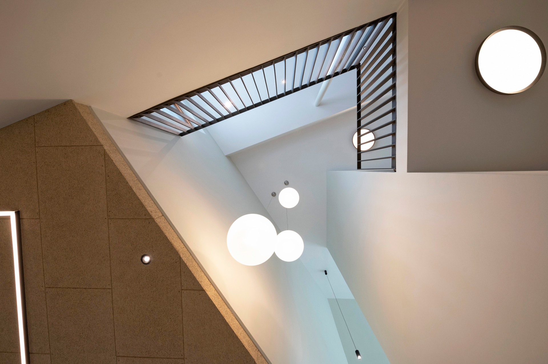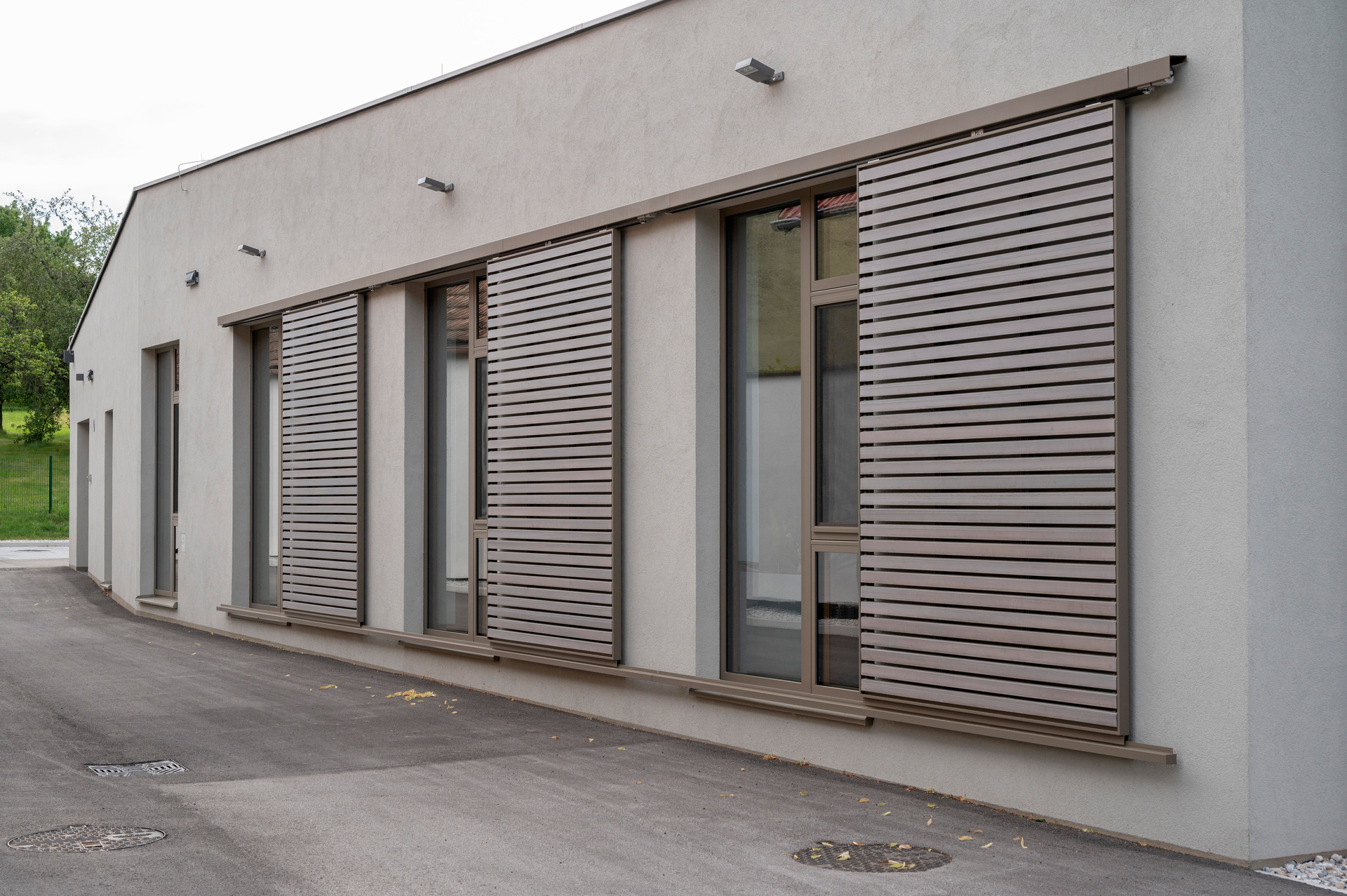 Das Gebäude ist in traditioneller Bauform in Massivbauweise mit geneigten Dächern, strukturierten Putzfassaden und Holzverschalungen errichtet. Durch die Orientierung der Hauptbelichtungsflächen Richtung Nordwesten wird eine optimale Belichtung gewährleistet, anderseits wird dadurch sommerliche Überhitzung vermieden.