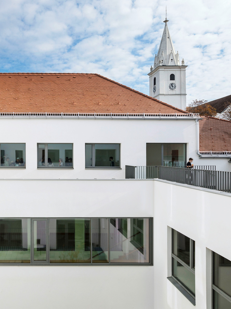 Der Zubau ist architektonisch klar gestaltet. Auf modische Akzente wird verzichtet. Die architektonische Qualität entsteht durch den räumlich durchgestalteten Baukörper, interessante Raumabfolgen, zurückhaltende Materialwahl und konsequent geplante Detaillösungen. Aus Kostengründen und Ergänzung zum Altbestand wird eine Vollwärmeschutzfassade vorgeschlagen. Die Fenster sind als Pfosten-Riegelkonstruktion in Holz-Alu geplant. (Text: Architekten)