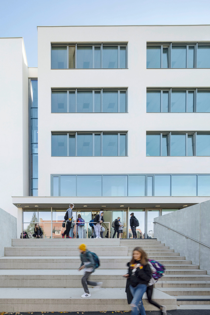 Über einen neu gestalteten Vorplatz erschließt man die Schule künftig über eine zweigeschossige, lichtdurchflutete Aula. Der Schulvorplatz ist vom Straßenniveau aus über eine Stufenanlage mit Sitzstufen erreichbar, die sich im Gebäudeinneren fortsetzt. In unmittelbarer Nähe zum neuen Haupteingang liegt die Zentralgarderobe. Im Erdgeschoß erschließt sich die Schule über eine großzügige Aula, die sich zum Schulgarten hin öffnet. Hier liegt auch der Speisesaal. Der gesamte Eingangsbereich ist optimal für Schulveranstaltungen nutzbar. In räumlicher Erweiterung der Aula befinden sich im Altbau die Verwaltung und das Konferenzzimmer, sowie ein großzügiger Aufenthaltsbereich zum bestehenden Innenhof. Der alte Schulzugang bleibt unverändert und kann von Schüler:innen und Lehrer:innen gleichermaßen verwendet werden.