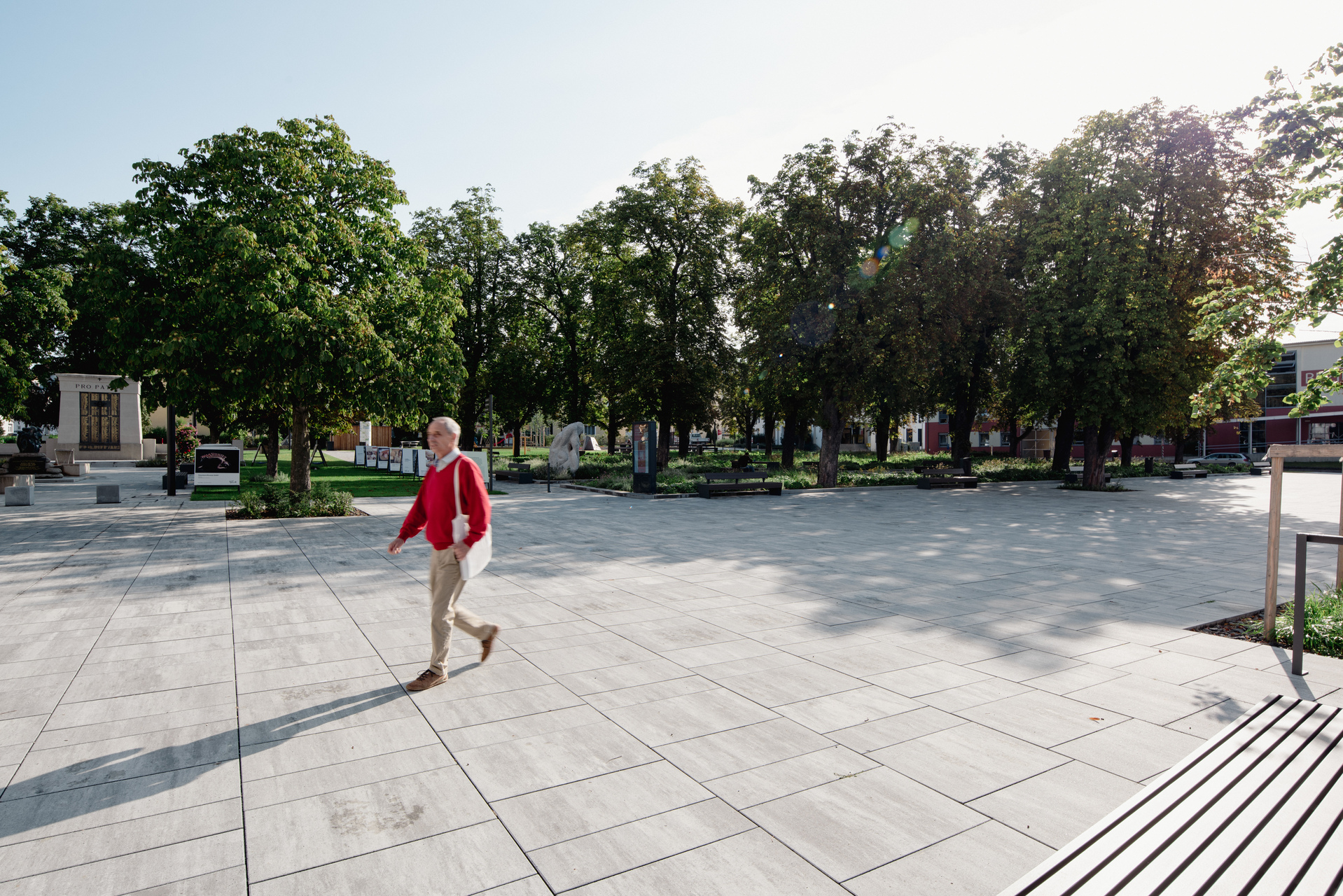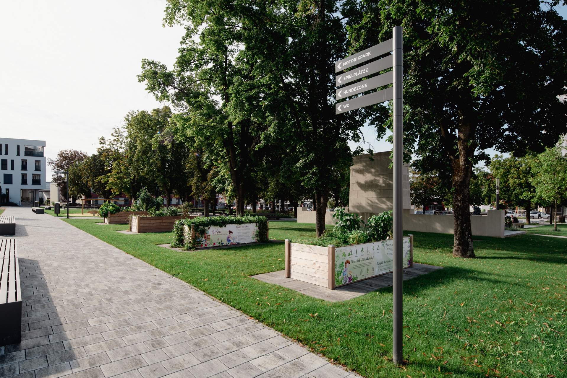 Der Baumhain (C) wird eine großzügig gestaltete Grünzone, in der punktuell Sitzbänke und Tische sowie mehrere Skulpturen aus dem Bestand platziert werden. Hier kann man den Schatten der Bäume genießen und an einem Tisch picknicken oder mit Freunden Karten spielen. Ein kleiner Spielplatz (D) rundet das Angebot für alle Altersgruppen ab. Im Bereich der Terrasse soll eine große Litfaßsäule errichtet werden, auf der alle Veranstaltungen in und um Oberwart angezeigt werden. Die Gräser- und Staudenbeete präsentieren die regionale Pflanzenwelt und spiegeln den Wechsel der Jahreszeiten wider. Der Bauernmarkt (B) findet im unteren Bereich der Anlage statt.