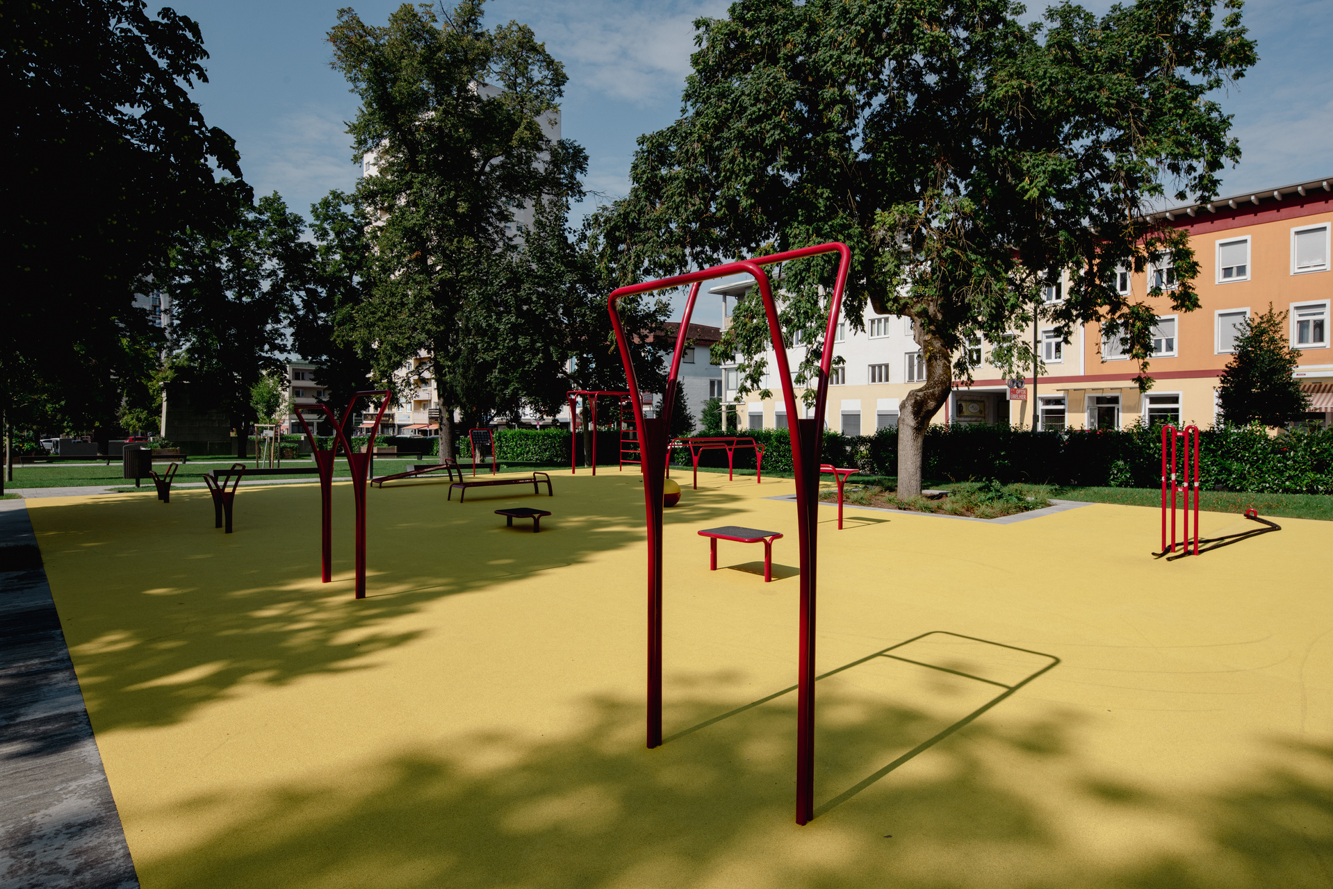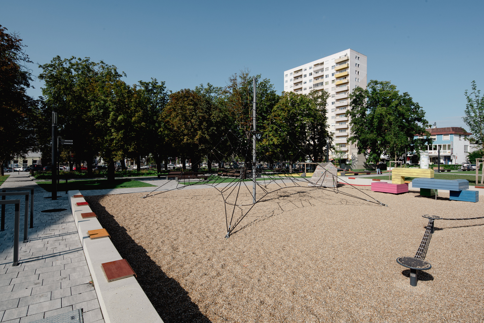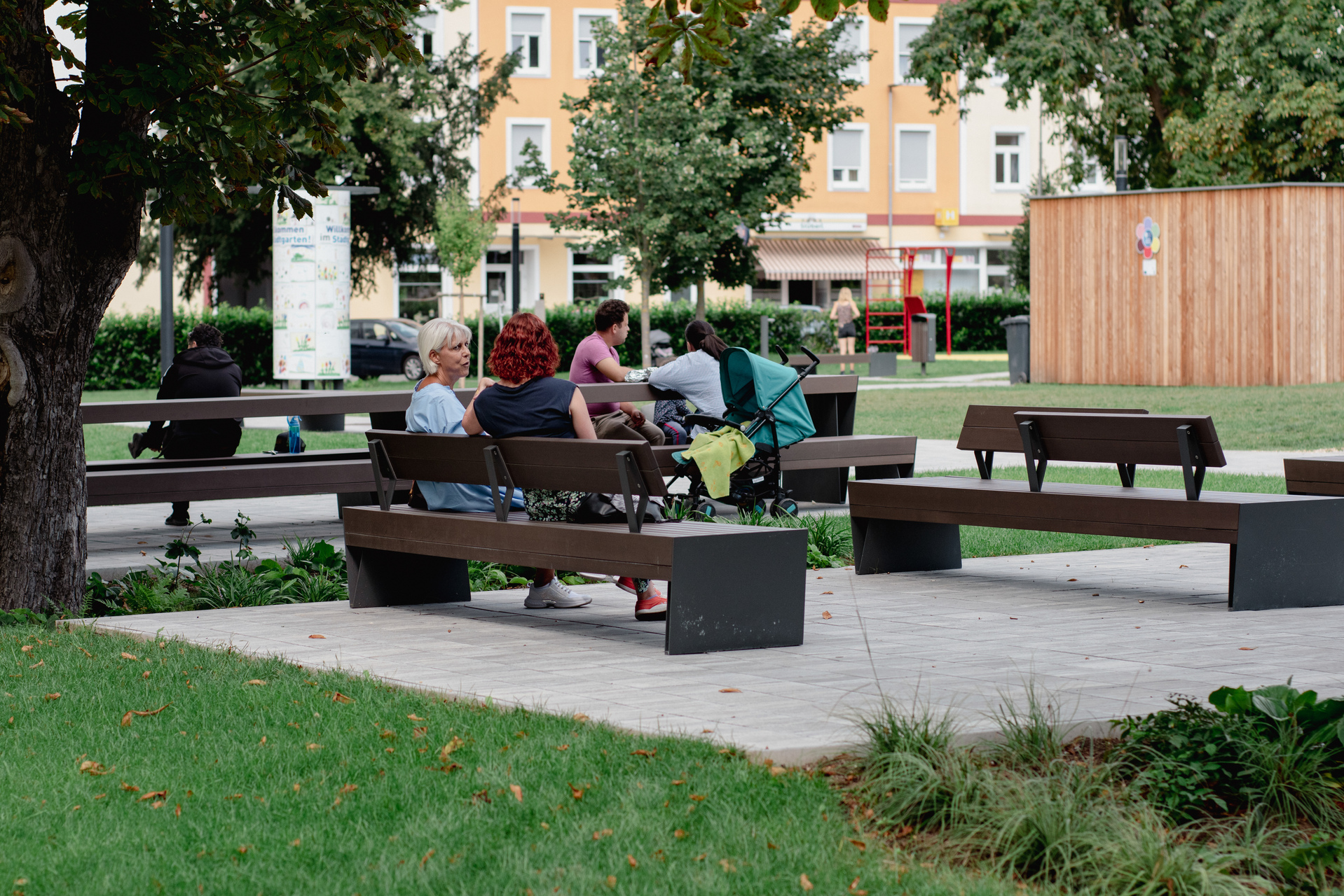 Im Zentrum des Oberwarter Stadtgartens entsteht ein neues Café mit großer Terrasse. Es wird das Kommunikationszentrum der Anlage, um das sich mehrere Zonen mit verschiedenen Aktivitätsangeboten reihen: Urban Gardening mit Obstgehölzen und mehreren Hochbeeten (E), ein Motorikpark (F), in dem sich Jung und Alt körperlich ertüchtigen können, und ein großer Spielplatz für Kinder (G). In allen Bereichen befinden sich zahlreiche Sitzgelegenheiten.